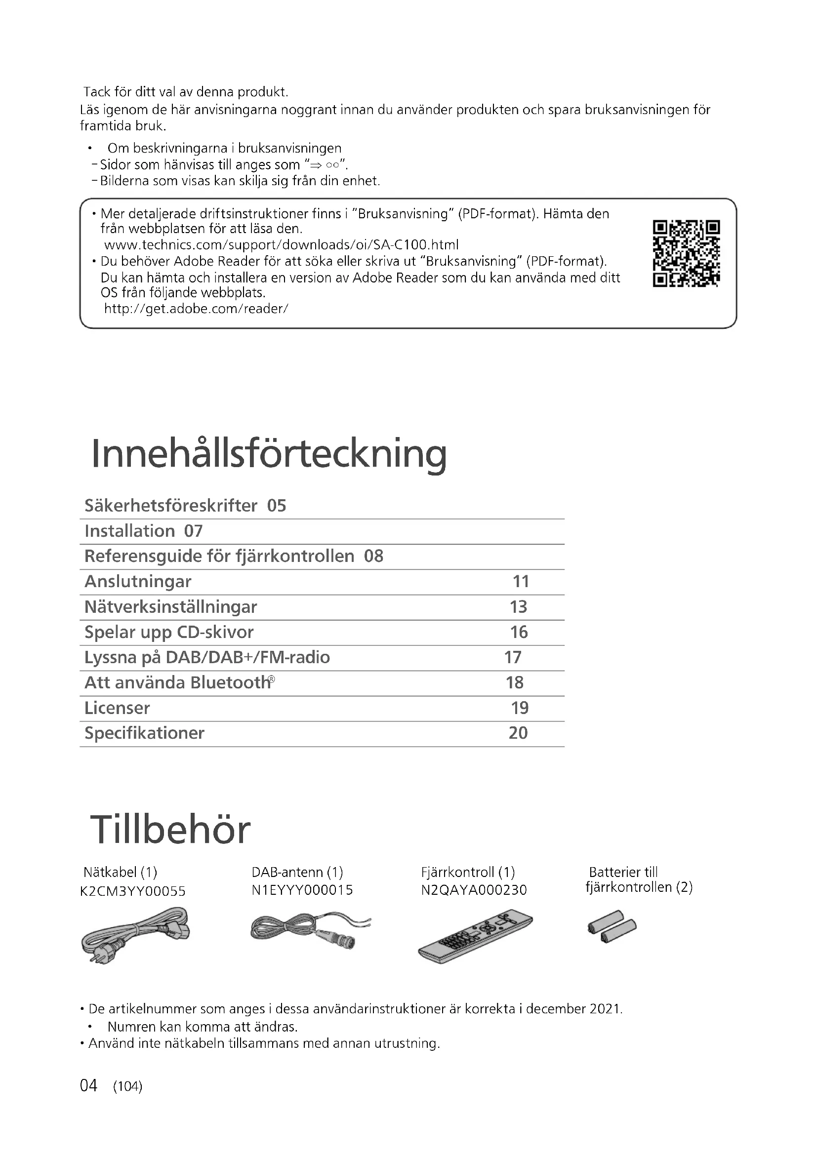 - Du behöver Adobe Reader för att söka eller skriva ut “Bruksanvisning” (PDF-format). Du kan hämta och installera en version av Adobe Reader som du kan använda med ditt OS från följande webbplats. http://get.adobe.com/reader/ Innehållsförteckning Säkerhetsföreskrifter 05 Installation 07 Referensguide för fjärrkontrollen 08 Anslutningar 11 Nätverksinställningar 13 Spelar upp CD-skivor 16 Lyssna på DAB/DAB+/FM-radio 17 Att använda Bluetooth