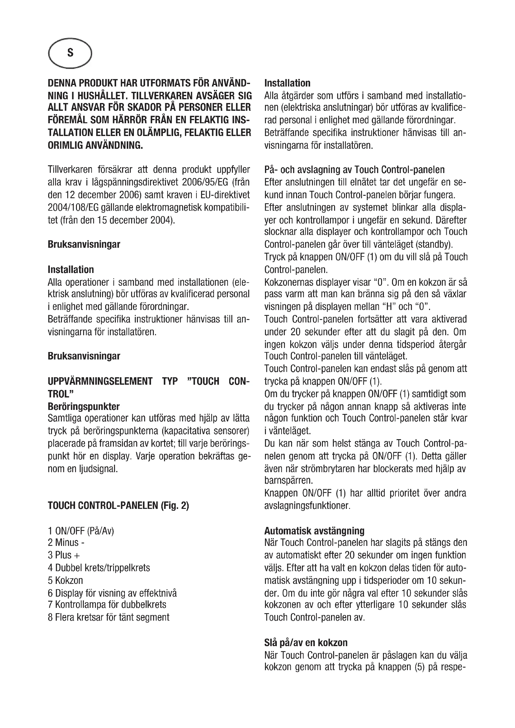 TROL” Beröringspunkter Samtliga operationer kan utföras med hjälp av lätta tryck på beröringspunkterna (kapacitativa sensorer) placerade på framsidan av kortet; till varje berörings- punkt hör en display. Varje operation bekräftas ge- nom en ljudsignal. TOUCH CONTROL-PANELEN (Fig. 2) 1 ON/OFF (På/Av) 2 Minus - 3 Plus + 4 Dubbel krets/trippelkrets 5 Kokzon 6 Display för visning av effektnivå 7 Kontrollampa för dubbelkrets 8 Flera kretsar för tänt segment Installation Alla åtgärder som utförs i samband med installatio- nen (elektriska anslutningar) bör utföras av kvalifice- rad personal i enlighet med gällande förordningar. Beträffande specifika instruktioner hänvisas till an- visningarna för installatören. På- och avslagning av Touch Control-panelen Efter anslutningen till elnätet tar det ungefär en se- kund innan Touch Control-panelen börjar fungera. Efter anslutningen av systemet blinkar alla displa- yer och kontrollampor i ungefär en sekund. Därefter slocknar alla displayer och kontrollampor och Touch Control-panelen går över till vänteläget (standby). Tryck på knappen ON/OFF (1) om du vill slå på Touch Control-panelen. Kokzonernas displayer visar “0”. Om en kokzon är så pass varm att man kan bränna sig på den så växlar visningen på displayen mellan “H” och “0”. Touch Control-panelen fortsätter att vara aktiverad under 20 sekunder efter att du slagit på den. Om ingen kokzon väljs under denna tidsperiod återgår Touch Control-panelen till vänteläget. Touch Control-panelen kan endast slås på genom att trycka på knappen ON/OFF (1). Om du trycker på knappen ON/OFF (1) samtidigt som du trycker på någon annan knapp så aktiveras inte någon funktion och Touch Control-panelen står kvar i vänteläget. Du kan när som helst stänga av Touch Control-pa- nelen genom att trycka på ON/OFF (1). Detta gäller även när strömbrytaren har blockerats med hjälp av barnspärren. Knappen ON/OFF (1) har alltid prioritet över andra avslagningsfunktioner. Automatisk avstängning När Touch Control-panelen har slagits på stängs den av automatiskt efter 20 sekunder om ingen funktion väljs. Efter att ha valt en kokzon delas tiden för auto- matisk avstängning upp i tidsperioder om 10 sekun- der. Om du inte gör några val efter 10 sekunder slås kokzonen av och efter ytterligare 10 sekunder slås Touch Control-panelen av. Slå på/av en kokzon När Touch Control-panelen är påslagen kan du välja kokzon genom att trycka på knappen (5) på respe- Sktive kokzon. Displayen (6) för den kokzon som valts börjar lysa med ett kraftigare ljus medan ljusstyrkan på resten av displayerna minskar. Om kokzonen är mycket het anges detta genom att displayen växelvis visar “H” och “0”. Tryck på knappen PLUS (3) eller MINUS (2) för att väl- ja effektnivå. Kokzonen börjar värmas upp. När kokzonen aktiverats kan du välja effektnivå. Tryck på knappen PLUS (3) och håll den nedtryckt. Effektnivån börjar på steg 1 och höjs ett steg var 0,4 sekund. Den maximala effektnivån är 9. Om du väljer effektnivå med hjälp av knappen MINUS (2) så är den första nivån steg 9 (maxnivån). Om du vill sänka effekten trycker du på knappen MINUS (2) och håller den nedtryckt. Effektnivån sänks ett steg var 0,4 sekund. Den lägsta effektnivån är 0. Tryck på knappen MINUS (2) eller PLUS (3) igen om du vill än- dra effektnivån. Avstängning av en kokzon Välj vilken kokzon som ska slås av genom att trycka på knappen (5) på den zonen. Displayen (6) för den kokzon som valts börjar lysa med ett kraftigare ljus medan ljusstyrkan på resten av displayerna minskar. Gör så här om du vill slå av kokzonen (ställa in den på “0”): Om du trycker samtidigt på knapparna PLUS (3) och MINUS (2) så ställs effektnivån in på 0. Du kan även använda knappen MINUS (2) för att minska effektnivån till 0. Om en kokzon är het (så att man kan bränna sig) så växlar visningen på displayen mellan “H” och “0”. Avstängning av alla kokzonerna Tryck på knappen ON/OFF (1) för att omedelbart stänga av samtliga kokzoner. När hällen befinner sig i vänteläget visas ett “H” på de displayer vars kokzo- ner är så pass varma att man kan bränna sig på dem. Alla andra displayer (de som är kalla) är släckta. Effektnivå Kokzonerna har 9 effektnivåer. Dessa anges med siffrorna “1” till “9” på lysdioddisplayerna (6) med sju segment. Indikator för restvärme Symbolen för restvärme varnar för att kokzonens glasdel är så pass het att man kan bränna sig om man tar på den. Temperaturen avgörs genom en ma- tematisk modell, och vid detektering av restvärme anges detta genom att bokstaven “H” (Het) visas på displayen för den kokzon som är het (lysdioddisplay med sju segment). Uppvärmning och avkylning beräknas med hjälp av: