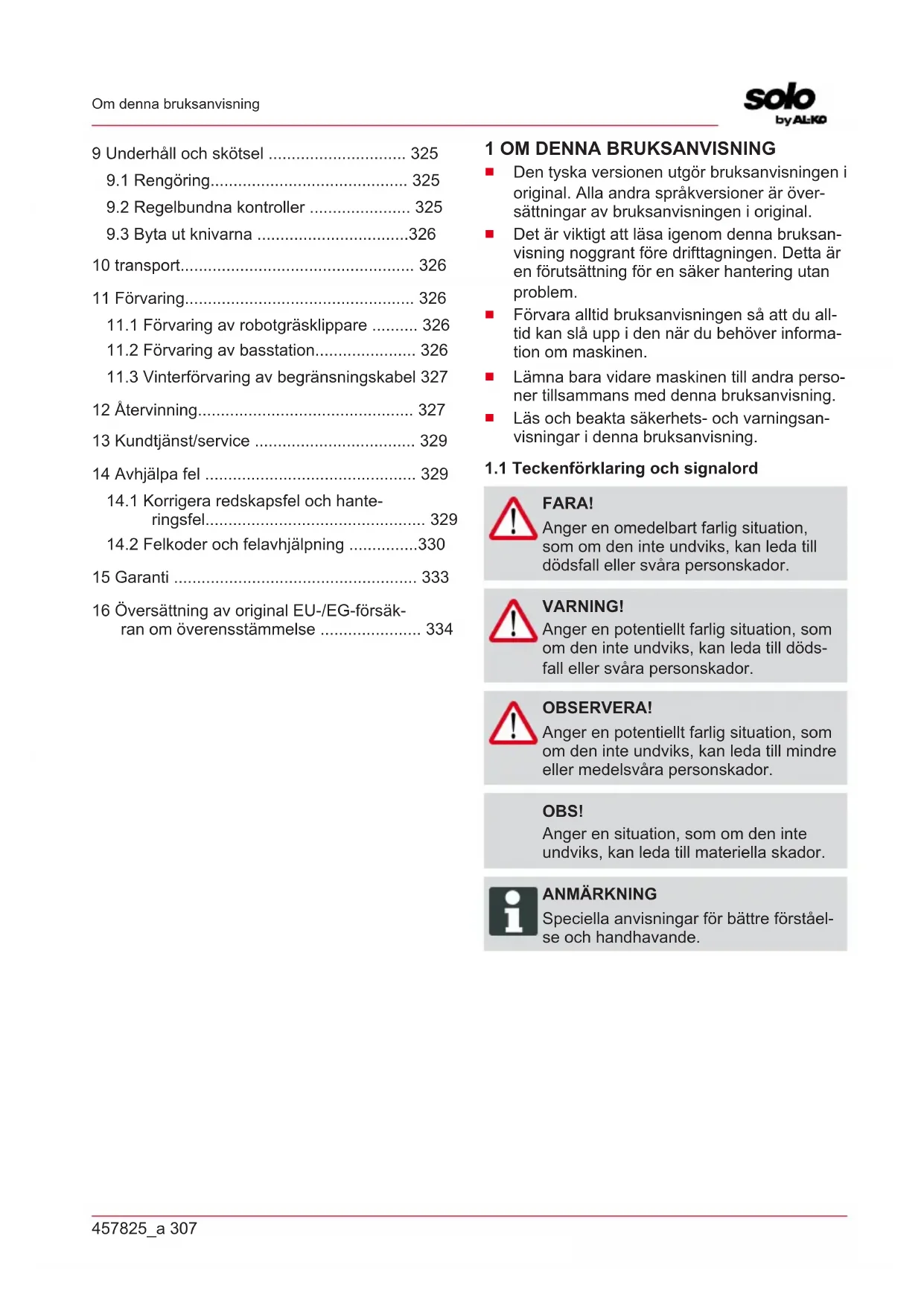 Förslitningsdelar, som på reservdelsbladet är inramade xxxxxx (x) Garantitiden inleds i och med den första slutkundens köp av produkten. Datum på inköpskvittot gäller. Vänd er med detta garantidokument och kvittot till en återförsäljare eller närmaste auktoriserade kund- tjänst. Köparens lagstadgade anspråk gentemot försäljaren berörs inte av denna förklaring.SE 334 Robolinho 700/1200/2000 Översättning av original EU-/EG-försäkran om överensstämmelse 16 ÖVERSÄTTNING AV ORIGINAL EU-/EG-FÖRSÄKRAN OM ÖVERENSSTÄMMELSE Vi förklarar härmed på eget ansvar att denna produkt i den form som den säljs på marknaden uppfyller kraven i de harmoniserade EU-direktiven samt de produktspecifika standarderna. Produkt Robotgräsklippare Serienummer G 105 0021 Tillverkare AL-KO Gardentech Austria GmbH Hauptstraße 51 A-8742 Obdach, Österrike Auktoriserad representant Andreas Hedrich Ichenhauser Str. 14 D-89359 Kötz, Tyskland Typ Robolinho 700 Robolinho 1200 Robolinho 2000 EU-direktiv 2006/42/EC 2014/53/EU 2011/65/EU Harmoniserade standarder EN 55014-1:2006+A1:2009+A2:2011 EN 55014-2:2015 EN 61000-6-1:2007 EN 61000-3-2:2014 EN 61000-3-3:2013 EN 60335-1:2012 EN 50636-2-107:2015 Obdach, 2018-08-01 Dr. Wolfgang Hergeth Managing Director457825_a 335 Käännös alkuperäisestä käyttöohjeesta KÄÄNNÖS ALKUPERÄISESTÄ KÄYTTÖOHJEESTA Sisällysluettelo 1 Tietoa käyttöohjeesta............................... 336