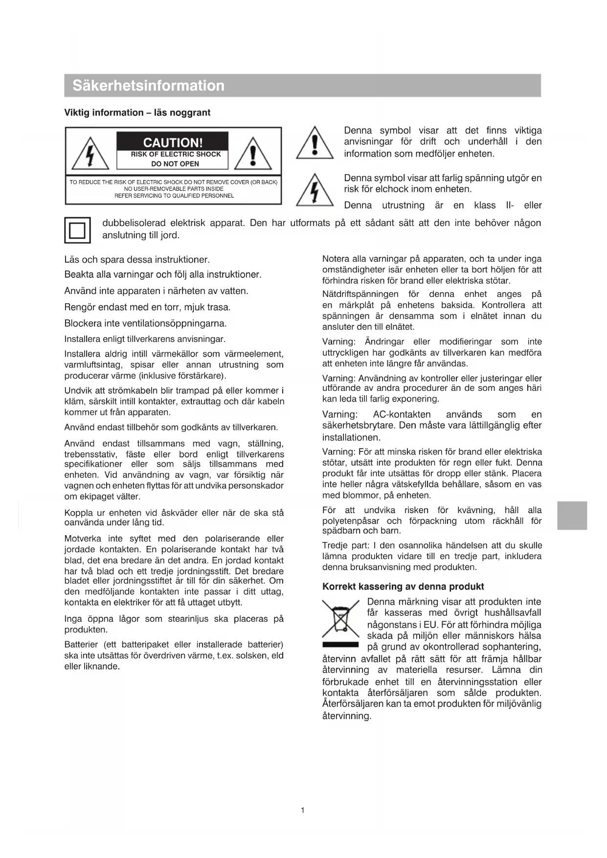 Säkerhetsinformation Viktig information – läs noggrant CAUTION! RISK OF ELECTRIC SHOCKDO NOT OPENTO REDUCE THE RISK OF ELECTRIC SHOCK DO NOT REMOVE COVER (OR BACK)NO USER-REMOVEABLE PARTS INSIDEREFER SERVICING TO QUALIFIED PERSONNEL Denna symbol visar att det finns viktiga anvisningar för drift och underhåll i den information som medföljer enheten. Denna symbol visar att farlig spänning utgör en risk för elchock inom enheten. Denna utrustning är en klass II- eller Läs och spara dessa instruktioner. Beakta alla varningar och följ alla instruktioner. Använd inte apparaten i närheten av vatten. Rengör endast med en torr, mjuk trasa. Blockera inte ventilationsöppningarna. Installera enligt tillverkarens anvisningar. Installera aldrig intill värmekällor som värmeelement, varmluftsintag, spisar eller annan utrustning som producerar värme (inklusive förstärkare). Undvik att strömkabeln blir trampad på eller kommer i kläm, särskilt intill kontakter, extrauttag och där kabeln kommer ut från apparaten. Använd endast tillbehör som godkänts av tillverkaren. Använd endast tillsammans med vagn, ställning, trebensstativ, fäste eller bord enligt tillverkarens specifikationer eller som säljs tillsammans med enheten. Vid användning av vagn, var försiktig när vagnen och enheten flyttas för att undvika personskador om ekipaget välter. Koppla ur enheten vid åskväder eller när de ska stå oanvända under lång tid. Motverka inte syftet med den polariserande eller jordade kontakten. En polariserande kontakt har två blad, det ena bredare än det andra. En jordad kontakt har två blad och ett tredje jordningsstift. Det bredare bladet eller jordningsstiftet är till för din säkerhet. Om den medföljande kontakten inte passar i ditt uttag, kontakta en elektriker för att få uttaget utbytt. Inga öppna lågor som stearinljus ska placeras på produkten. Batterier (ett batteripaket eller installerade batterier) ska inte utsättas för överdriven värme, t.ex. solsken, eld eller liknande. Notera alla varningar på apparaten, och ta under inga omständigheter isär enheten eller ta bort höljen för att förhindra risken för brand eller elektriska stötar. Nätdriftspänningen för denna enhet anges på en märkplåt på enhetens baksida. Kontrollera att spänningen är densamma som i elnätet innan du ansluter den till elnätet. Varning: Ändringar eller modifieringar som inte uttryckligen har godkänts av tillverkaren kan medföra att enheten inte längre får användas. Varning: Användning av kontroller eller justeringar eller utförande av andra procedurer än de som anges häri kan leda till farlig exponering. Varning: AC-kontakten används som en säkerhetsbrytare. Den måste vara lättillgänglig efter installationen. Varning: För att minska risken för brand eller elektriska stötar, utsätt inte produkten för regn eller fukt. Denna produkt får inte utsättas för dropp eller stänk. Placera inte heller några vätskefyllda behållare, såsom en vas med blommor, på enheten. För att undvika risken för kvävning, håll alla polyetenpåsar och förpackning utom räckhåll för spädbarn och barn. Tredje part: I den osannolika händelsen att du skulle lämna produkten vidare till en tredje part, inkludera denna bruksanvisning med produkten. Korrekt kassering av denna produkt Denna märkning visar att produkten inte får kasseras med övrigt hushållsavfall någonstans i EU. För att förhindra möjliga skada på miljön eller människors hälsa på grund av okontrollerad sophantering, återvinn avfallet på rätt sätt för att främja hållbar återvinning av materiella resurser. Lämna din förbrukade enhet till en återvinningsstation eller kontakta återförsäljaren som sålde produkten. Återförsäljaren kan ta emot produkten för miljövänlig återvinning. dubbelisolerad elektrisk apparat. Den har utformats på ett sådant sätt att den inte behöver någon anslutning till jord.2