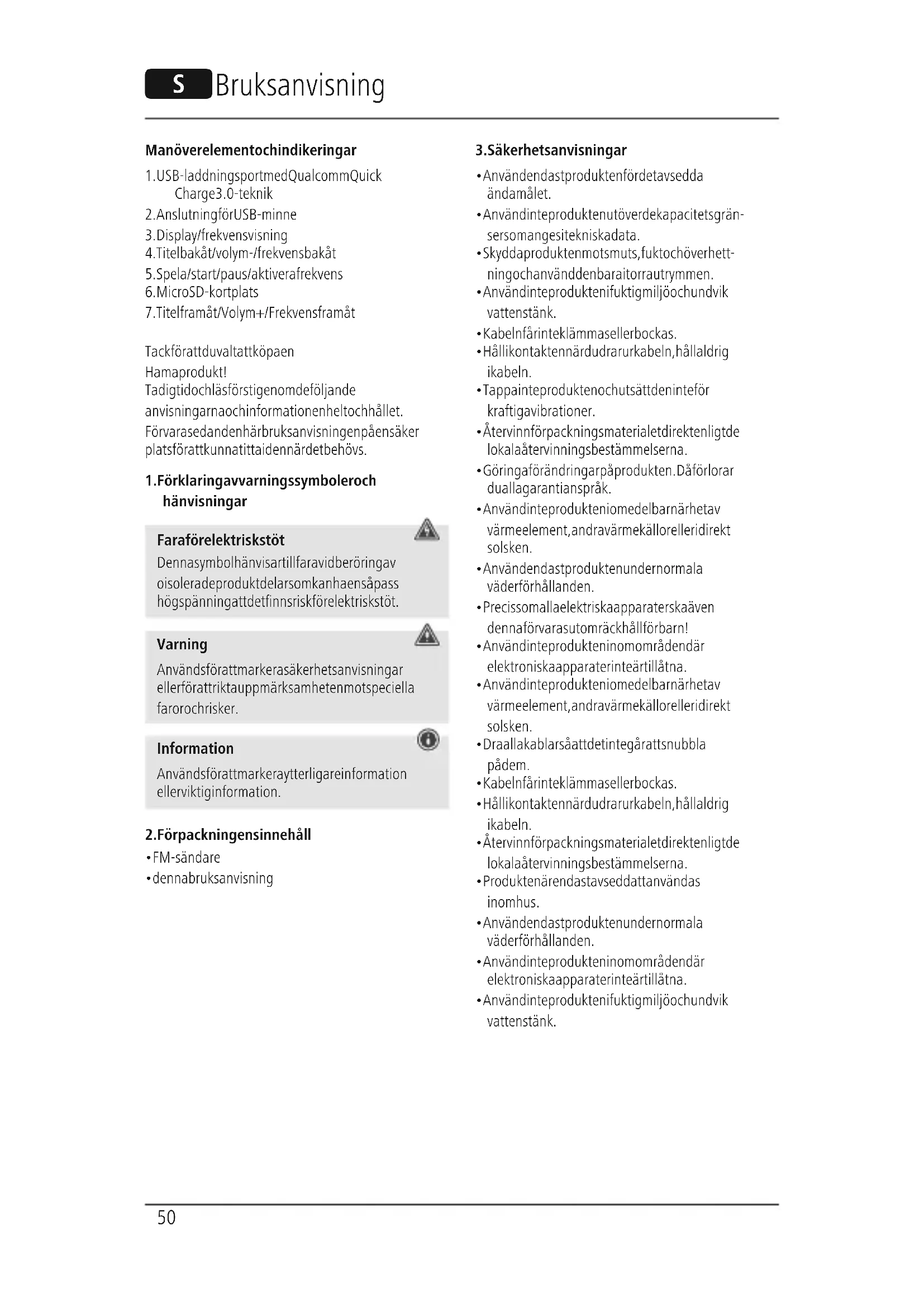 - Använd inte produkten i fuktig miljö och undvik vattenstänk.51 Information