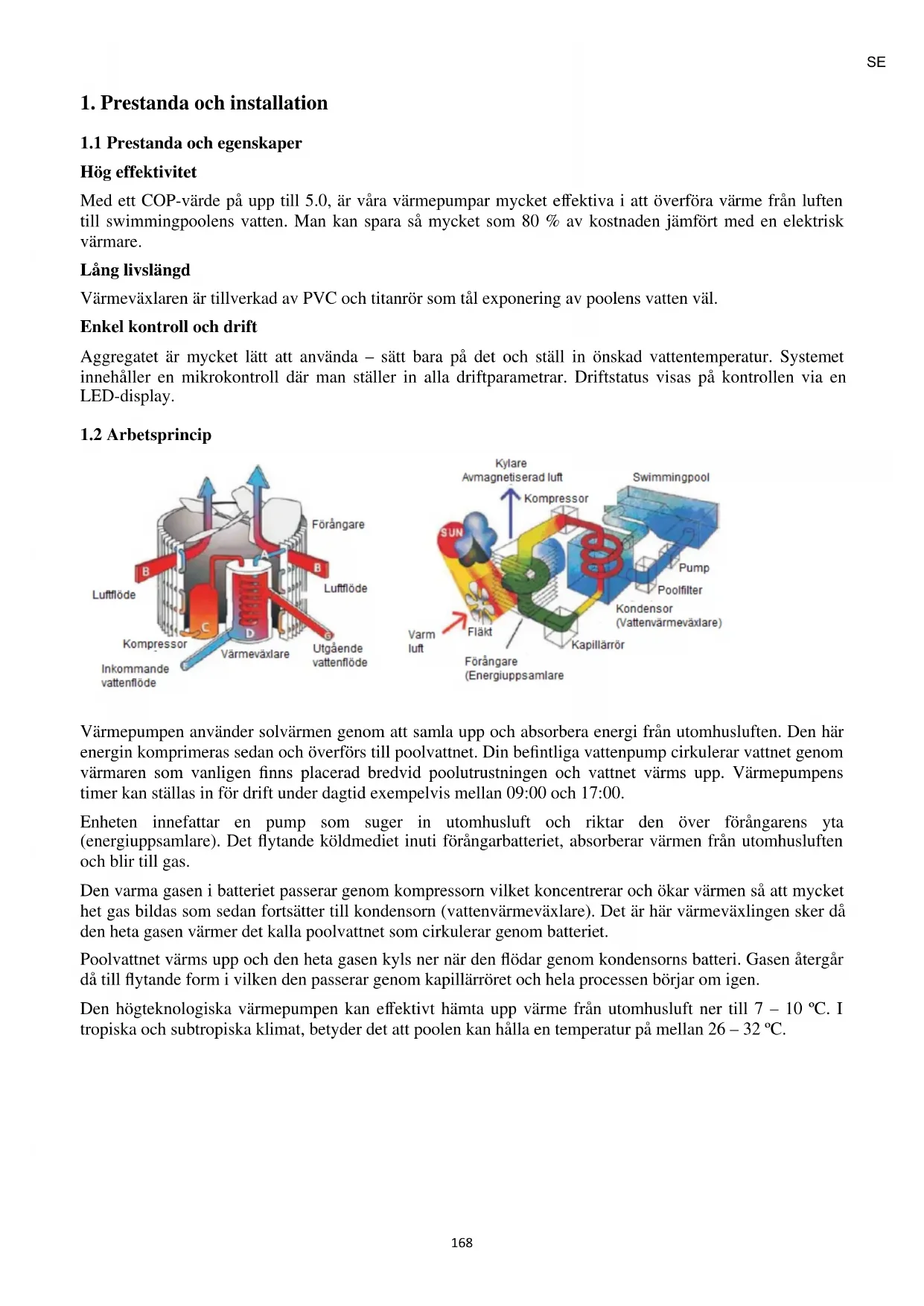 Värmepumpen använder solvärmen genom att samla upp och absorbera energi från utomhusluften. Den här energin komprimeras sedan och överförs till poolvattnet. Din befintliga vattenpump cirkulerar vattnet genom värmaren som vanligen finns placerad bredvid poolutrustningen och vattnet värms upp. Värmepumpens timer kan ställas in för drift under dagtid exempelvis mellan 09:00 och 17:00. Enheten innefattar en pump som suger in utomhusluft och riktar den över förångarens yta (energiuppsamlare). Det flytande köldmediet inuti förångarbatteriet, absorberar värmen från utomhusluften och blir till gas. Den varma gasen i batteriet passerar genom kompressorn vilket koncentrerar och ökar värmen så att mycket het gas bildas som sedan fortsätter till kondensorn (vattenvärmeväxlare). Det är här värmeväxlingen sker då den heta gasen värmer det kalla poolvattnet som cirkulerar genom batteriet. Poolvattnet värms upp och den heta gasen kyls ner när den flödar genom kondensorns batteri. Gasen återgår då till flytande form i vilken den passerar genom kapillärröret och hela processen börjar om igen. Den högteknologiska värmepumpen kan effektivt hämta upp värme från utomhusluft ner till 7 – 10 ºC. I tropiska och subtropiska klimat, betyder det att poolen kan hålla en temperatur på mellan 26 – 32 ºC.