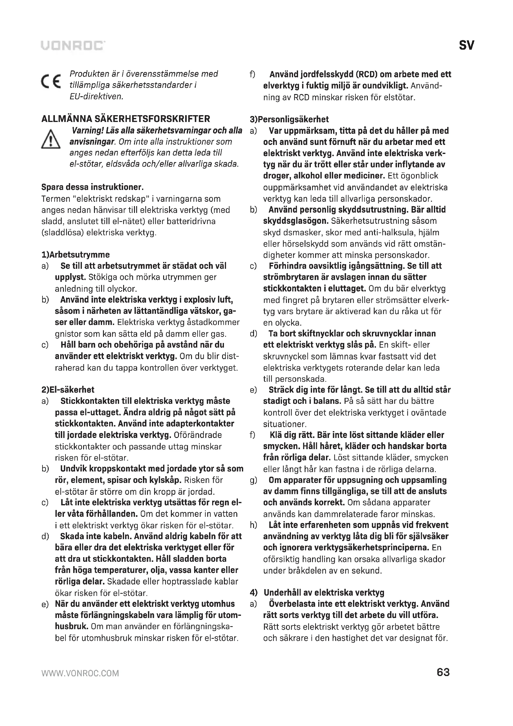 Stäng alltid av maskinen och ta ut batteripaketet från maskinen innan underhåll. Rengör maskinen hus regelbundet med en mjuk trasa, helst efter varje gång du använder maskinen. Se till att ventilationsöppningarna är fria från damm och smuts. Ta bort mycket ihållande smuts med en mjuk trasa fuktad med tvållösning. Använd inte lösningsmedel som bensin, alkohol, ammoniak osv. Sådana kemikalier skadar de syntetiska kompo- nenterna. MILJÖ Felaktig och/eller kasserad elektrisk eller elektronisk utrustning måste lämnas in på lämpliga återvinningsstationer. Endast för EU-länder Släng inte elverktyg i hushållsavfallet. Enligt det europeiska WEEE-direktivet 2012/19/EU för avfall från elektrisk och elektronisk utrustning och dess tillämpning nationellt ska elverktyg som inte längre kan användas samlas in separat och kasseras på ett miljövänligt sätt. GARANTIVILLKOR VONROC produkter är utvecklade enligt högsta kva- litetsstandard och garanteras vara utan defekter både vad gäller material och tillverkning under den period som stipuleras enligt lag med början från ursprungligt inköpsdatum. Om något fel uppstår på produkten under denna period på grund av material- och/eller tillverkningsfel skall VONROC kontaktas direkt. Följande omständigheter exkluderas från denna garanti: