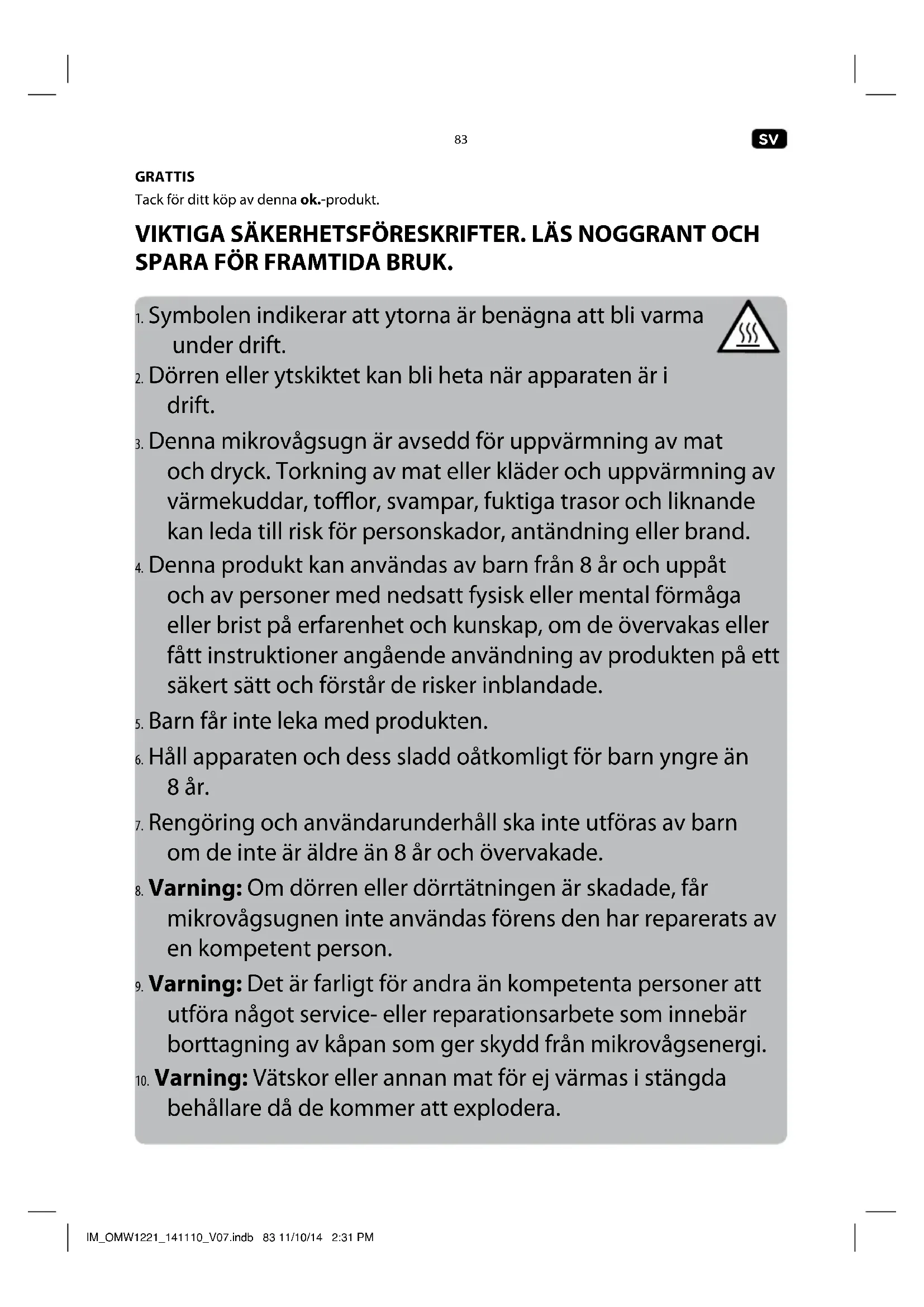 10. Varning: Vätskor eller annan mat för ej värmas i stängda