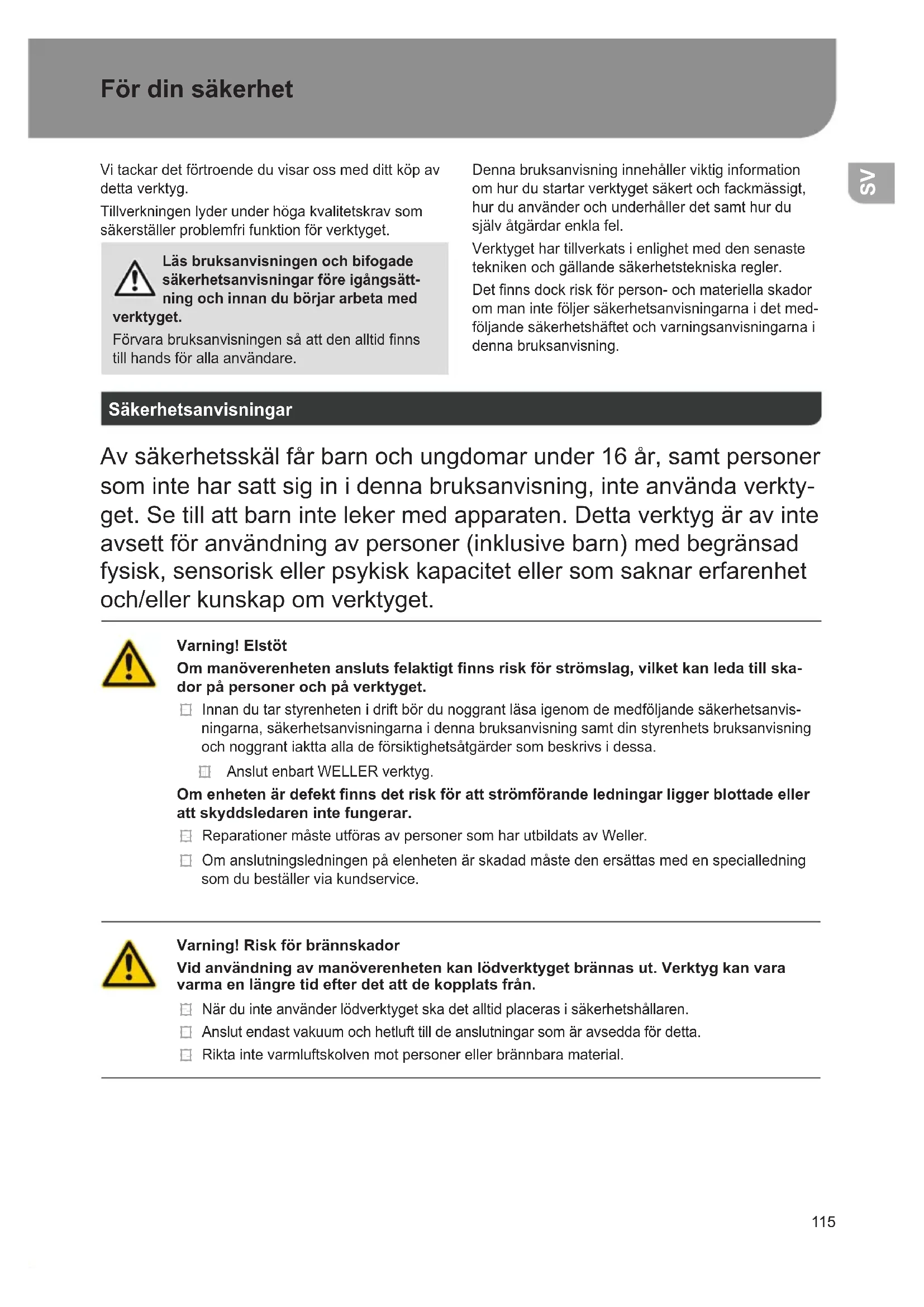 NL113 Foutmeldingen en verhelpen van fouten Melding/symptoom Mogelijke oorzaak Maatregelen om het probleem te verhelpen Indicatie „- - -“ Werktuig werd niet herkend Werktuig defect Aansluiting van het werktuig aan het toestel controleren Aangesloten werktuig controleren Geendisplayfunctie(displayuit) Geen netspanning voorhanden Netschakelaar inschakelen. Netspanning controleren. Toestelzekering controleren. Geen vacuüm aan het soldeerru- imwerktuig Vakuum nicht angeschlossen Soldeerruimmond verstopt. Pomp defect Vacuümslang aan de vacuümaansluiting aansluiten Soldeerruimmond met reinigingswerktuig onder- houden. Ontoereikend vacuüm aan het soldeerruimwerktuig Filterpatroon aan het soldeerruimwerktuig vol Hoofdltervol Filterpatroon aan het soldeerruimwerktuig vervangen Hoofdlterelementaanhet soldeerstation vervangen Geen lucht aan de heteluchtbout Luchtslang niet aangesloten Hoofdltervol Luchtslang aansluiten of controleren Hoofdlterelementaanhet soldeerstation vervangen Technische Gegevens NL114 Symbolen Attentie! Bedieningshandleidinglezen! Voor het uitvoeren van alle werk- zaamheden aan het toestel altijd de stekker uit het stopcontact trekken. ESD-conform design en ESD- conforme werkplek Potentiaalvereffening CE-teken Britssymboolvanovereenstemming Zekering Veiligheidstransformator Solderen Soldeerruimen Hete lucht Afvoer Afgedankte elektrische en elektroni- sche apparatuur moeten gescheiden ingezameld en afgevoerd worden. Verwijder de verlichtingsmiddelen uit de apparatuur voordat u deze afvoert. Informeer bij uw gemeente of bij uw vakhandelaarnaarrecyclingbedrijven en inzamelpunten. Al naargelang de lokaal van toepassing zijnde voor- schriften kunnen detailhandelaren ver- plicht zijn om afgedankte elektrische en elektronische apparatuur kosteloos terug te nemen. Geef uw afgedankte elektrische en elektronische appara- tuurafvoorrecyclingenhelpzomee om de behoefte aan grondstoffen te verminderen. Afgedankte elektrische en elektronische apparatuur bevatten waardevolle,recyclebarematerialen die, mits ze niet milieuvriendelijk wor- den afgevoerd, negatieve gevolgen kunnen hebben voor het milieu en uw gezondheid. Verwijder persoonlijke ge- gevens van uw afgedankte apparatuur voordat u deze afvoert. Vervuildeltersmoetenalsgevaarlijkaf- val worden behandeld. Voer vervan- gentoestelonderdelen,ltersofoude toestel conform de voorschriften van uw land af. Garantie Aanspraak op garantie van de koper verjaart een jaar na levering van het product. Dit geldt niet voor regresrecht van de koper volgens §§ 478, 479 BGB. Voor een door ons verleende garantie zijn we alleen aansprakelijk als de kwaliteits- of houdbaar- heidsgarantie door ons schriftelijk en met vermel- ding van het begrip „Garantie“ afgegeven werd. De garantie vervalt bij ondeskundig gebruik en als doorongekwaliceerdepersoneningrepenuitgevo- erd werden. Technischewijzigingenvoorbehouden! Gelieve u te informeren op www.weller-tools.com. Technische Gegevens NL115 För din säkerhet Vi tackar det förtroende du visar oss med ditt köp av dettaverktyg. Tillverkningenlyderunderhögakvalitetskravsom säkerställerproblemfrifunktionförverktyget. Läs bruksanvisningen och bifogade säkerhetsanvisningar före igångsätt- ning och innan du börjar arbeta med verktyget. Förvarabruksanvisningensåattdenalltidnns till hands för alla användare. Denna bruksanvisning innehåller viktig information omhurdustartarverktygetsäkertochfackmässigt, hur du använder och underhåller det samt hur du själv åtgärdar enkla fel. Verktygethartillverkatsienlighetmeddensenaste tekniken och gällande säkerhetstekniska regler. Detnnsdockriskförperson-ochmateriellaskador om man inte följer säkerhetsanvisningarna i det med- följande säkerhetshäftet och varningsanvisningarna i denna bruksanvisning. Säkerhetsanvisningar Av säkerhetsskäl får barn och ungdomar under 16 år, samt personer sominteharsattsiginidennabruksanvisning,inteanvändaverkty- get.Setillattbarnintelekermedapparaten.Dettaverktygäravinte avsett för användning av personer (inklusive barn) med begränsad fysisk,sensoriskellerpsykiskkapacitetellersomsaknarerfarenhet och/ellerkunskapomverktyget. Varning! Elstöt Om manöverenheten ansluts felaktigt nns risk för strömslag, vilket kan leda till ska- dor på personer och på verktyget. Innandutarstyrenhetenidriftbördunoggrantläsaigenomdemedföljandesäkerhetsanvis- ningarna,säkerhetsanvisningarnaidennabruksanvisningsamtdinstyrenhetsbruksanvisning och noggrant iaktta alla de försiktighetsåtgärder som beskrivs i dessa. AnslutenbartWELLERverktyg. Om enheten är defekt nns det risk för att strömförande ledningar ligger blottade eller att skyddsledaren inte fungerar. Reparationer måste utföras av personer som har utbildats av Weller. Om anslutningsledningen på elenheten är skadad måste den ersättas med en specialledning som du beställer via kundservice. Varning! Risk för brännskador Vid användning av manöverenheten kan lödverktyget brännas ut. Verktyg kan vara varma en längre tid efter det att de kopplats från. Närduinteanvänderlödverktygetskadetalltidplacerasisäkerhetshållaren. Anslut endast vakuum och hetluft till de anslutningar som är avsedda för detta. Rikta inte varmluftskolven mot personer eller brännbara material. SV116 Varning! Brand- och explosionsrisk! Brandrisk på grund av heta verktyg Närduinteanvänderlödverktygetskadetalltidplacerasisäkerhetshållaren. Rikta inte varmluftskolven mot personer eller brännbara material. Håll explosiva och antändliga föremål på avstånd. Täckinteöververktyget. Varning! Risk för skada Vid transport kan enheten eller delar av enheten falla ner. Använd Maskinen Enligt Anvisningarna FörsörjningsenhetWELLERlödverktyg. Använd endast reparationsstationen enligt de metoder och villkor för lödning och avlödning som anges i bruksanvisningen. Brandfarliga gaser och vätskor får inte sugas ut. Verktygetfårenbartdrivasmedkor- rektisattaochförver