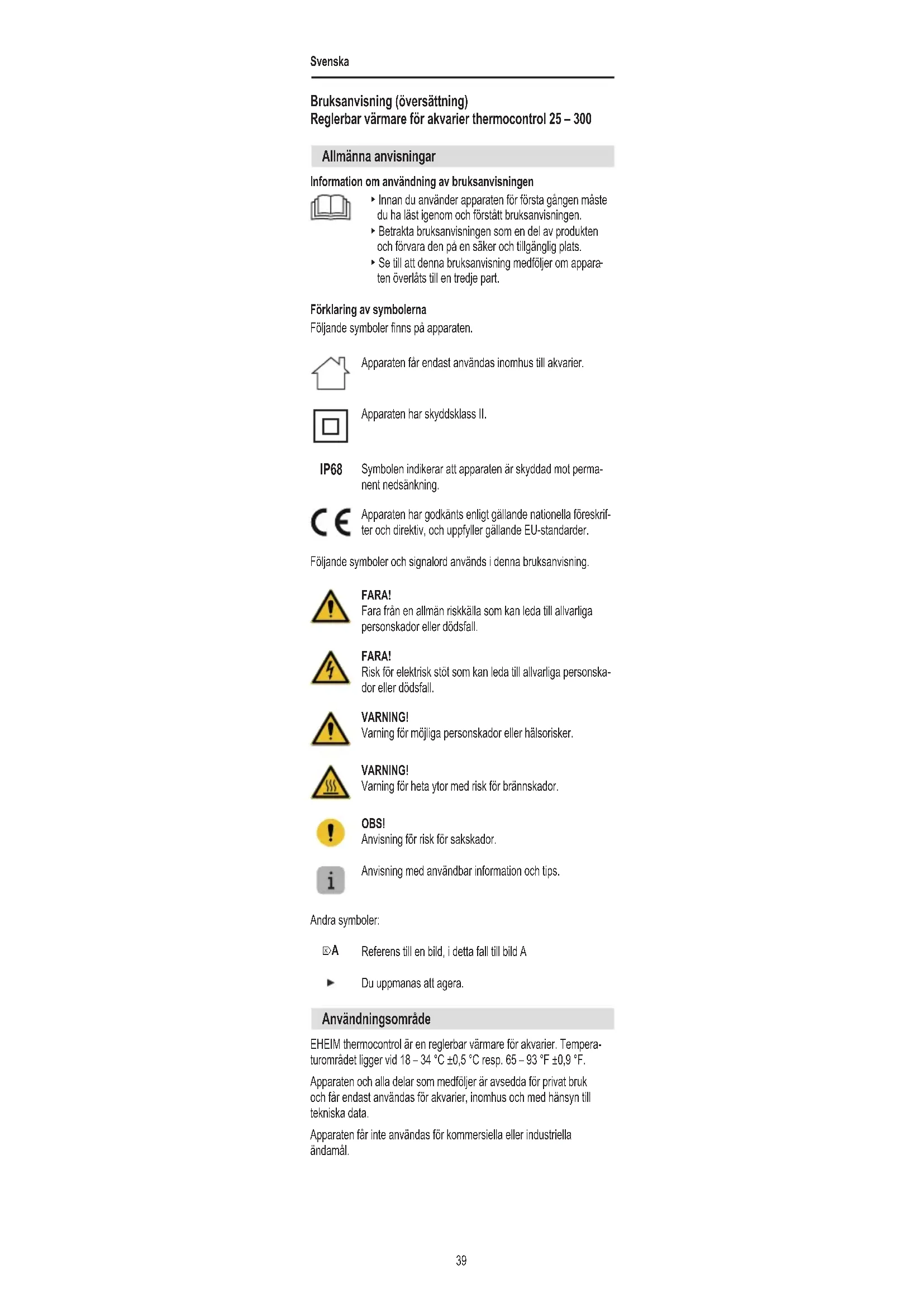 Användningsområde EHEIM thermocontrol är en reglerbar värmare för akvarier. Tempera- turområdet ligger vid 18 – 34 °C ±0,5 °C resp. 65 – 93 °F ±0,9 °F. Apparaten och alla delar som medföljer är avsedda för privat bruk och får endast användas för akvarier, inomhus och med hänsyn till tekniska data. Apparaten får inte användas för kommersiella eller industriella ändamål.Svenska