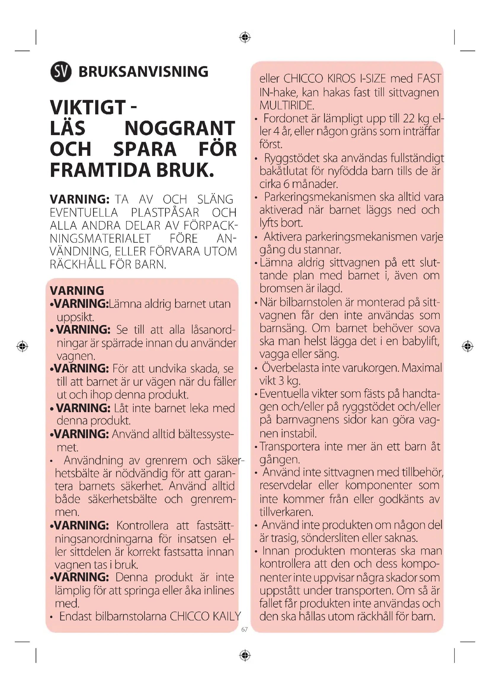 - VARNING: För att undvika skada, se till att barnet är ur vägen när du fäller ut och ihop denna produkt.