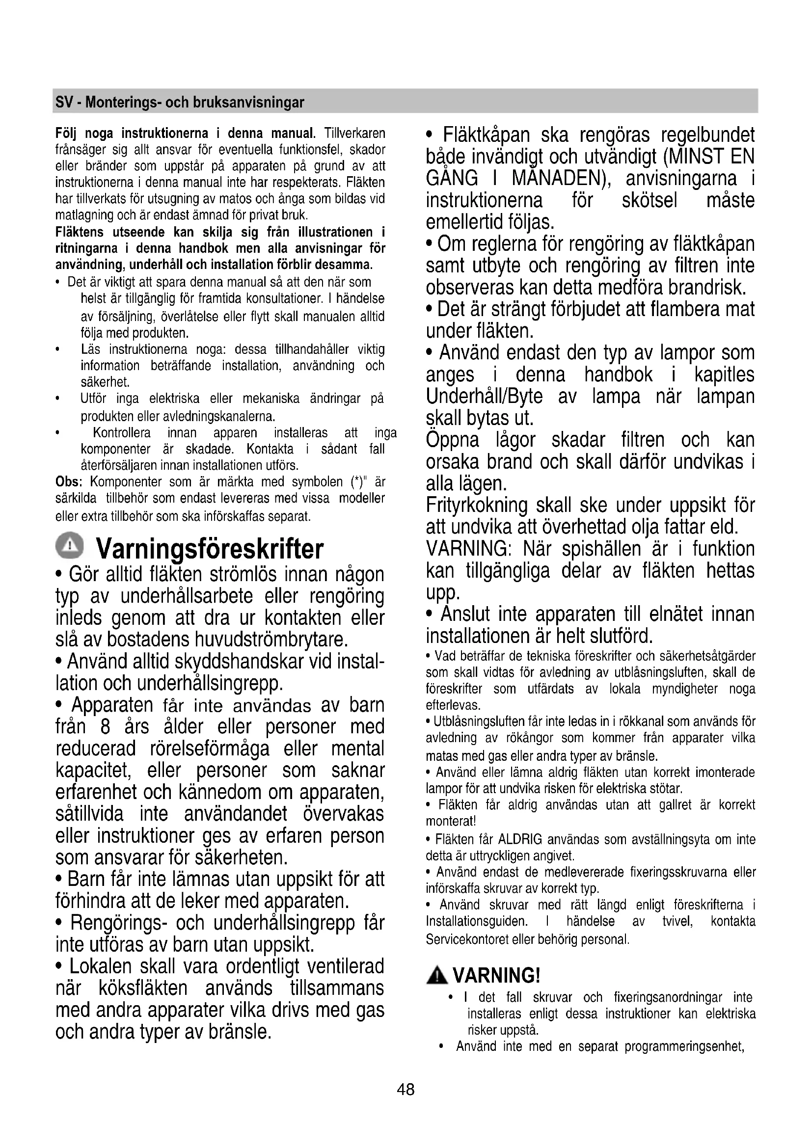 Για την αντικατάσταση των λαμπτήρων, επικοινωνήστε με το εξουσιοδοτημένο κέντρο ανταλλακτικών.48 SV - Monterings- och bruksanvisningar Följ noga instruktionerna i denna manual. Tillverkaren frånsäger sig allt ansvar för eventuella funktionsfel, skador eller bränder som uppstår på apparaten på grund av att instruktionerna i denna manual inte har respekterats. Fläkten har tillverkats för utsugning av matos och ånga som bildas vid matlagning och är endast ämnad för privat bruk. Fläktens utseende kan skilja sig från illustrationen i ritningarna i denna handbok men alla anvisningar för användning, underhåll och installation förblir desamma.