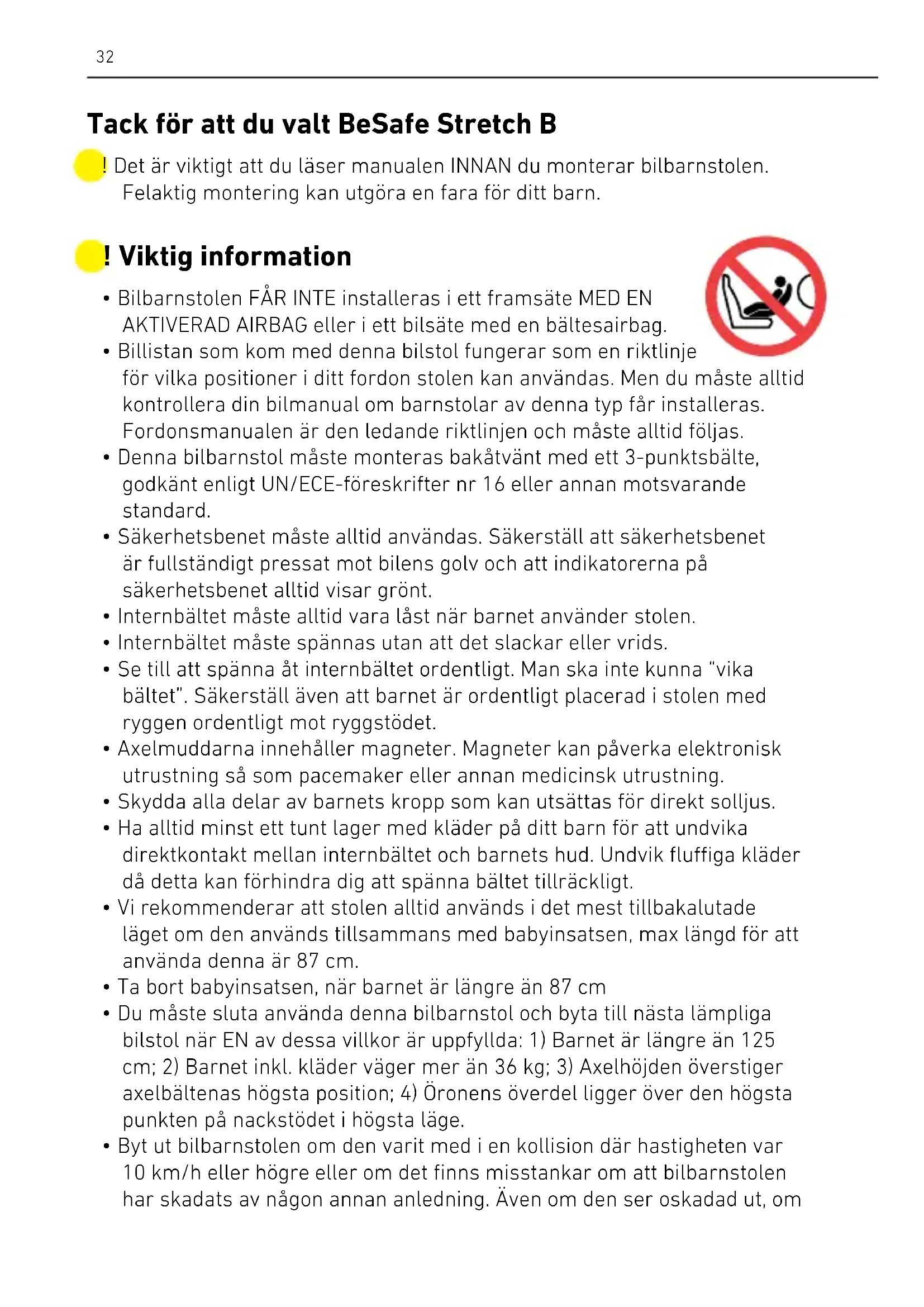 - Byt ut bilbarnstolen om den varit med i en kollision där hastigheten var 10 km/h eller högre eller om det finns misstankar om att bilbarnstolen har skadats av någon annan anledning. Även om den ser oskadad ut, om ! Det är viktigt att du läser manualen INNAN du monterar bilbarnstolen. Felaktig montering kan utgöra en fara för ditt barn. Tack för att du valt BeSafe Stretch B33 ni skulle råka i en ny olycka, kanske inte bilbarnstolen skyddar ditt barn till den nivå den utformats för.