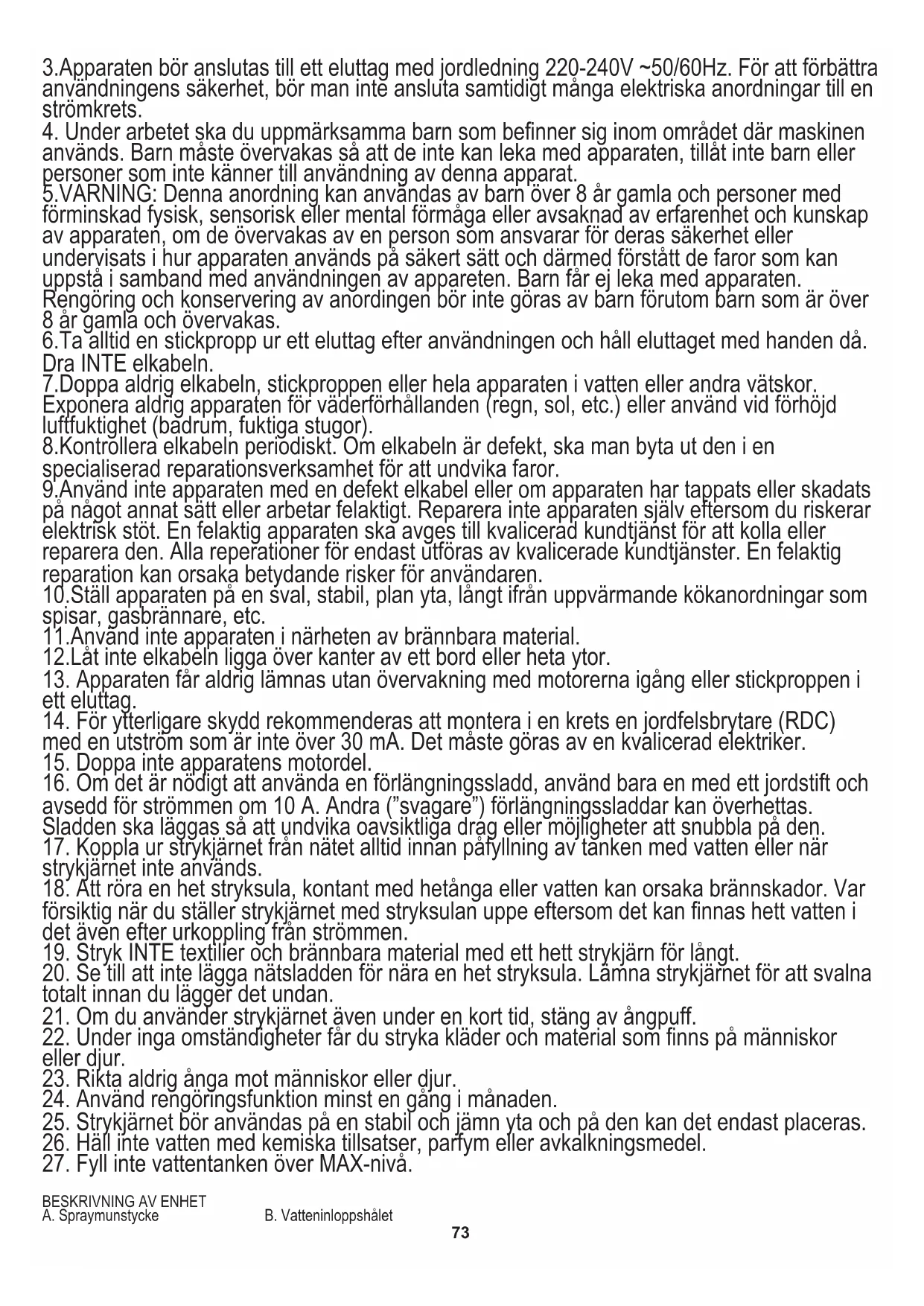 2.Denna aparat är avsedd för användning bara i hushållet. Använd inte för andra syften som inte är föremål av denna apparat. 72A. Spraymunstycke B. Vatteninloppshålet