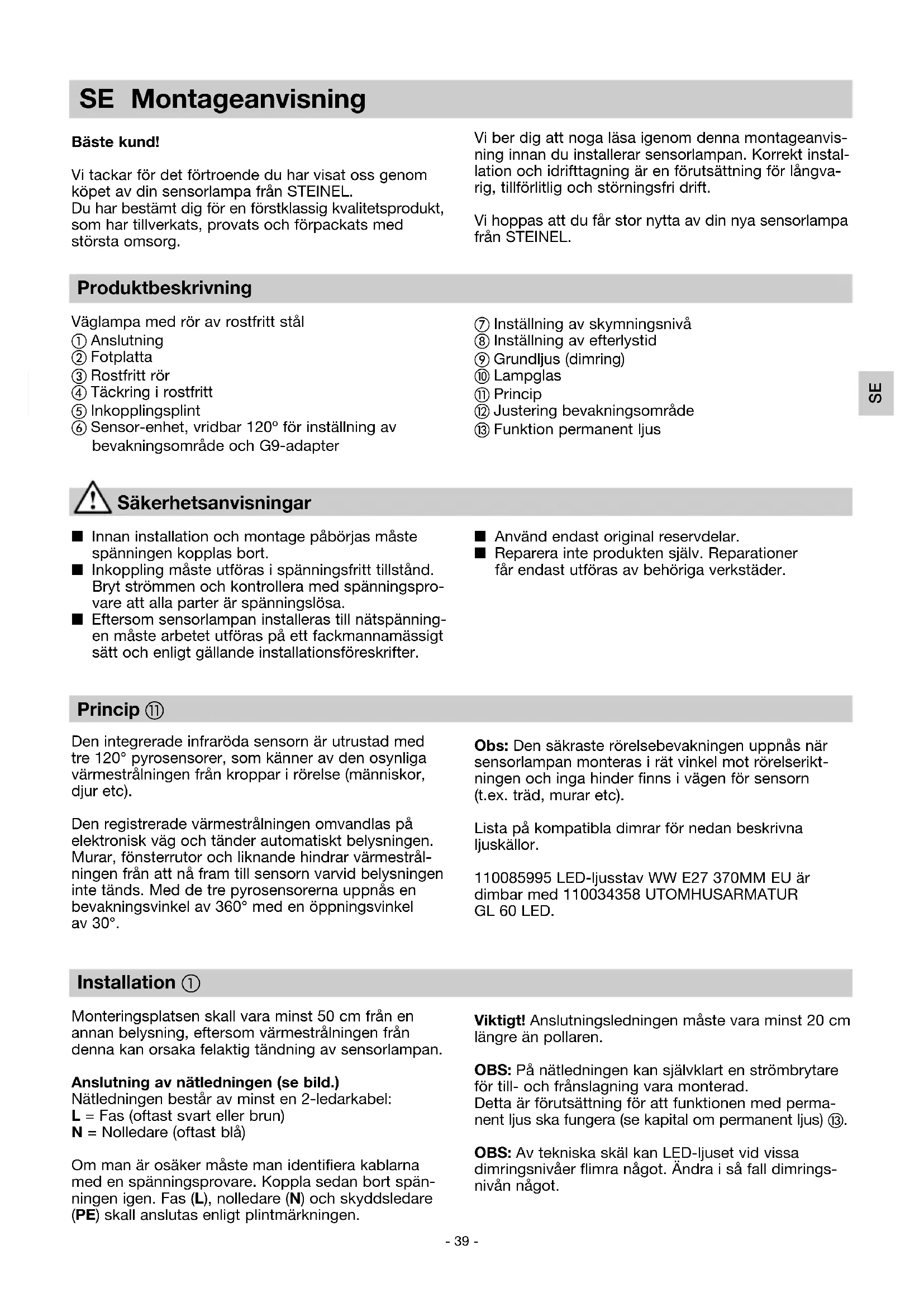 Apenas para estados membros da U.E.: Segundo a diretiva europeia relativa aos resíduos de equipamentos elétricos e eletrónicos, e a respetiva transposição para o direito nacional, todos os equi- pamentos elétricos e eletrónicos em fim de vida útil devem ser recolhidos separadamente e entregues nos pontos de recolha previstos para fins de reutiliza- ção ecológica. Fonte de luz substituível por consumidor final.- 39 - Installation 햲 Monteringsplatsen skall vara minst 50 cm från en annan belysning, eftersom värmestrålningen från denna kan orsaka felaktig tändning av sensorlampan. Anslutning av nätledningen (se bild.) Nätledningen består av minst en 2-ledarkabel: L = Fas (oftast svart eller brun) N = Nolledare (oftast blå) Om man är osäker måste man identifiera kablarna med en spänningsprovare. Koppla sedan bort spän- ningen igen. Fas (L), nolledare (N) och skyddsledare (PE) skall anslutas enligt plintmärkningen. Princip 햽 Den integrerade infraröda sensorn är utrustad med tre 120° pyrosensorer, som känner av den osynliga värmestrålningen från kroppar i rörelse (människor, djur etc). Den registrerade värmestrålningen omvandlas på elektronisk väg och tänder automatiskt belysningen. Murar, fönsterrutor och liknande hindrar värmestrål- ningen från att nå fram till sensorn varvid belysningen inte tänds. Med de tre pyrosensorerna uppnås en bevakningsvinkel av 360° med en öppningsvinkel av 30°. Produktbeskrivning Väglampa med rör av rostfritt stål 햲 Anslutning 햳 Fotplatta 햴 Rostfritt rör 햵 Täckring i rostfritt 햶 Inkopplingsplint 햷 Sensor-enhet, vridbar 120º för inställning av bevakningsområde och G9-adapter SE Montageanvisning Bäste kund! Vi tackar för det förtroende du har visat oss genom köpet av din sensorlampa från STEINEL. Du har bestämt dig för en förstklassig kvalitetsprodukt, som har tillverkats, provats och förpackats med största omsorg. Säkerhetsanvisningar n Innan installation och montage påbörjas måste spänningen kopplas bort. n Inkoppling måste utföras i spänningsfritt tillstånd. Bryt strömmen och kontrollera med spänningspro- vare att alla parter är spänningslösa. n Eftersom sensorlampan installeras till nätspänning- en måste arbetet utföras på ett fackmannamässigt sätt och enligt gällande installationsföreskrifter. Vi ber dig att noga läsa igenom denna montageanvis- ning innan du installerar sensorlampan. Korrekt instal- lation och idrifttagning är en förutsättning för långva- rig, tillförlitlig och störningsfri drift. Vi hoppas att du får stor nytta av din nya sensorlampa från STEINEL. n Använd endast original reservdelar. n Reparera inte produkten själv. Reparationer får endast utföras av behöriga verkstäder. 햸 Inställning av skymningsnivå 햹 Inställning av efterlystid 햺 Grundljus (dimring) 햻 Lampglas 햽 Princip 햾 Justering bevakningsområde 햿 Funktion permanent ljus Obs: Den säkraste rörelsebevakningen uppnås när sensorlampan monteras i rät vinkel mot rörelserikt- ningen och inga hinder finns i vägen för sensorn (t.ex. träd, murar etc). Lista på kompatibla dimrar för nedan beskrivna ljuskällor. 110085995 LED-ljusstav WW E27 370MM EU är dimbar med 110034358 UTOMHUSARMATUR GL 60 LED. Viktigt! Anslutningsledningen måste vara minst 20 cm längre än pollaren. OBS: På nätledningen kan självklart en strömbrytare för till- och frånslagning vara monterad. Detta är förutsättning för att funktionen med perma- nent ljus ska fungera (se kapital om permanent ljus) 햿. OBS: Av tekniska skäl kan LED-ljuset vid vissa dimringsnivåer flimra något. Ändra i så fall dimrings- nivån något. SE- 40 - Tekniska data Mått (H x Ø): 1038 x Ø 120 (glas) / Ø 220 (fot) mm Spänning: 220-240 V / 50/60 Hz Systemeffekt (Pon)*: 9,2W/E27 Ljusström/ljusutbyte ljuskälla*: 954 lm, 104 lm/W Standby armatur: 0,8W Ljusström/ljusutbyte: 781 lm, 79,9 lm/W Färgtemperatur*: 3000 K (varmvit) Färgåtergivningsindex*: Ra=82 Medellång livslängd för beräkningen*: L70B50 vid 25°C: >20 000timmar Färgkonsistens SDCM*: startvärde: 3 Ljusintensitetsfördelning*: