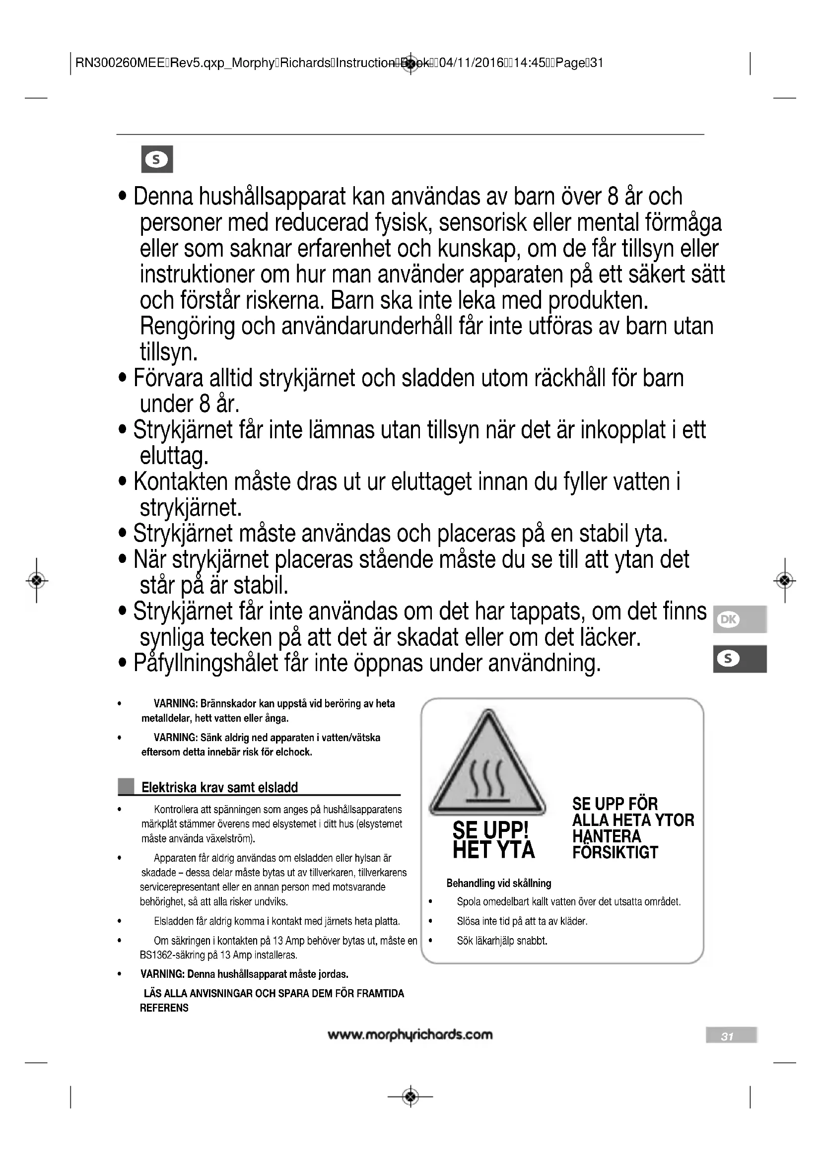 RN300260MEERev5.qxp_MorphyRichardsInstructionBook04/11/201614:45Page3334 VARNING: Ånga och kokhett vatten kommer att rinna ut ur hålen i stryksulan. Det tvättar bort avlagringar och mineraler som samlats i ångkammaren. 10 När rengöringen är klar flyttas knappen för variabel ånga tillbaka till ‘O’. 11 Res upp strykjärnet och låt det svalna helt. 12 Torka av stryksulan med en fuktig trasa. Töm ut allt kvarvarande vatten efter rengöringen. VARNING: Undvik att händer och kropp kommer i kontakt med det heta vattnet. VARNING: Försök inte avkalka stryksulan med avkalkningsprodukter. Kontakta oss Hjälplinje Ring vår hjälplinje om du får problem med din apparat. Det är troligare att vi kan hjälpa dig än återförsäljaren som sålde apparaten. Ha produktnamn, modellnummer och serienummer till hands när du ringer så kan vi hjälpa dig snabbare med din fråga. Tala med oss Om du har frågor eller kommentarer eller vill ha bra tips så att du kan utnyttja dina produkter fullt ut, kan du ansluta dig till oss på nätet: Blogg: www.morphyrichards.co.uk/blog Facebook: www.facebook.com/morphyrichardsuk Twitter: www.twitter.com/loveyourmorphy Webbplats: www.morphyrichards.com