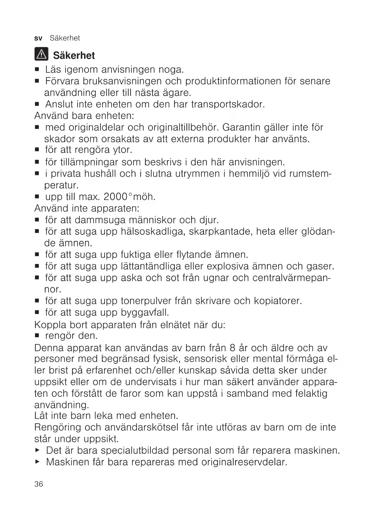Säkerhet ¡ Läs igenom anvisningen noga. ¡ Förvara bruksanvisningen och produktinformationen för senare användning eller till nästa ägare. ¡ Anslut inte enheten om den har transportskador. Använd bara enheten: ¡ med originaldelar och originaltillbehör. Garantin gäller inte för skador som orsakats av att externa produkter har använts. ¡ för att rengöra ytor. ¡ för tillämpningar som beskrivs i den här anvisningen. ¡ i privata hushåll och i slutna utrymmen i hemmiljö vid rumstem- peratur. ¡ upp till max. 2000°möh. Använd inte apparaten: ¡ för att dammsuga människor och djur. ¡ för att suga upp hälsoskadliga, skarpkantade, heta eller glödan- de ämnen. ¡ för att suga upp fuktiga eller flytande ämnen. ¡ för att suga upp lättantändliga eller explosiva ämnen och gaser. ¡ för att suga upp aska och sot från ugnar och centralvärmepan- nor. ¡ för att suga upp tonerpulver från skrivare och kopiatorer. ¡ för att suga upp byggavfall. Koppla bort apparaten från elnätet när du: ¡ rengör den. Denna apparat kan användas av barn från 8år och äldre och av personer med begränsad fysisk, sensorisk eller mental förmåga el- ler brist på erfarenhet och/eller kunskap såvida detta sker under uppsikt eller om de undervisats i hur man säkert använder appara- ten och förstått de faror som kan uppstå i samband med felaktig användning. Låt inte barn leka med enheten. Rengöring och användarskötsel får inte utföras av barn om de inte står under uppsikt. ▶ Det är bara specialutbildad personal som får reparera maskinen. ▶ Maskinen får bara repareras med originalreservdelar.Säkerhet sv