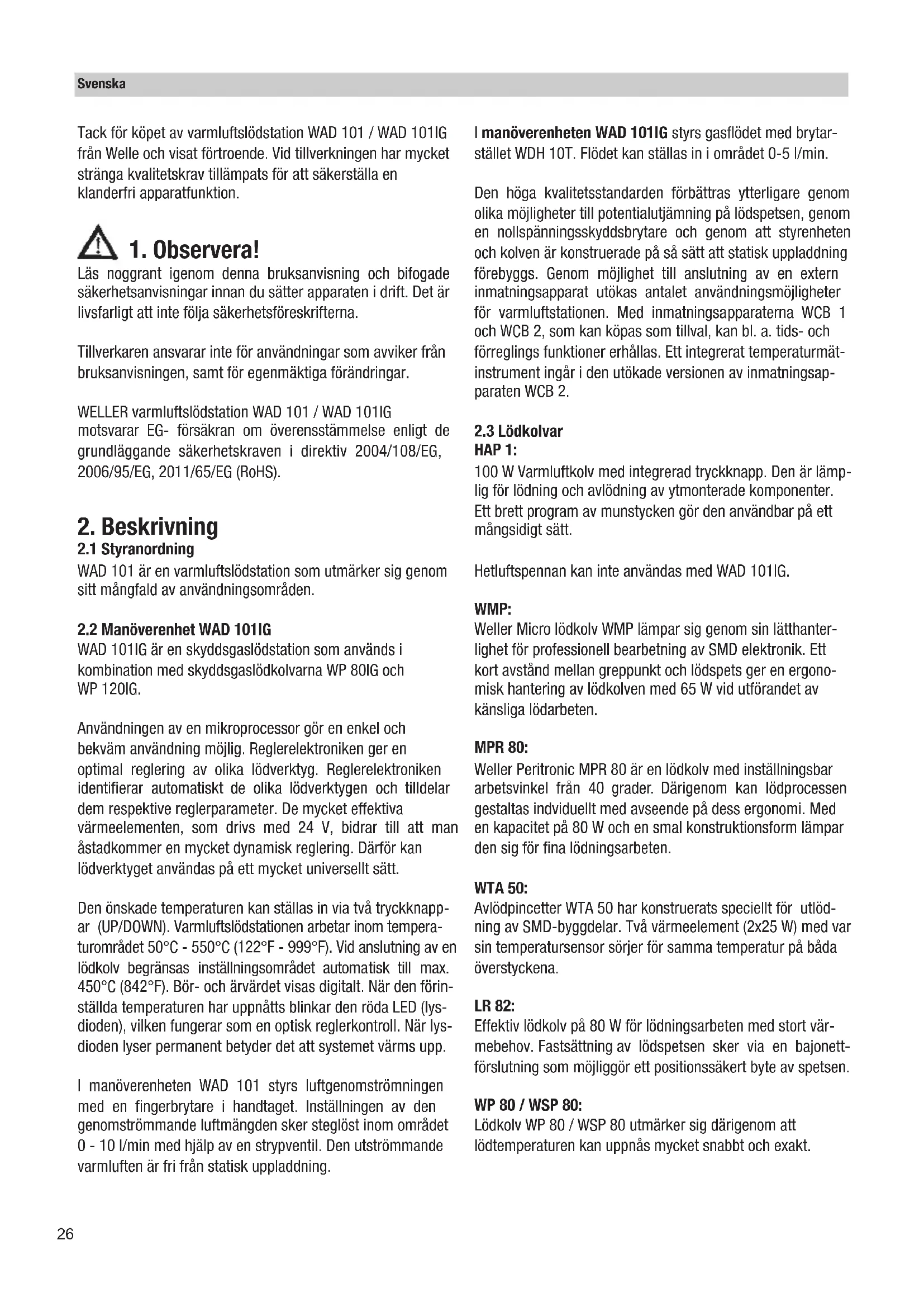 Läs noggrant igenom denna bruksanvisning och bifogade säkerhetsanvisningar innan du sätter apparaten i drift. Det är livsfarligt att inte följa säkerhetsföreskrifterna. Tillverkaren ansvarar inte för användningar som avviker från bruksanvisningen, samt för egenmäktiga förändringar. WELLER varmluftslödstation WAD 101 / WAD 101IG motsvarar EG- försäkran om överensstämmelse enligt de grundläggande säkerhetskraven i direktiv 2004/108/EG, 2006/95/EG, 2011/65/EG (RoHS).
