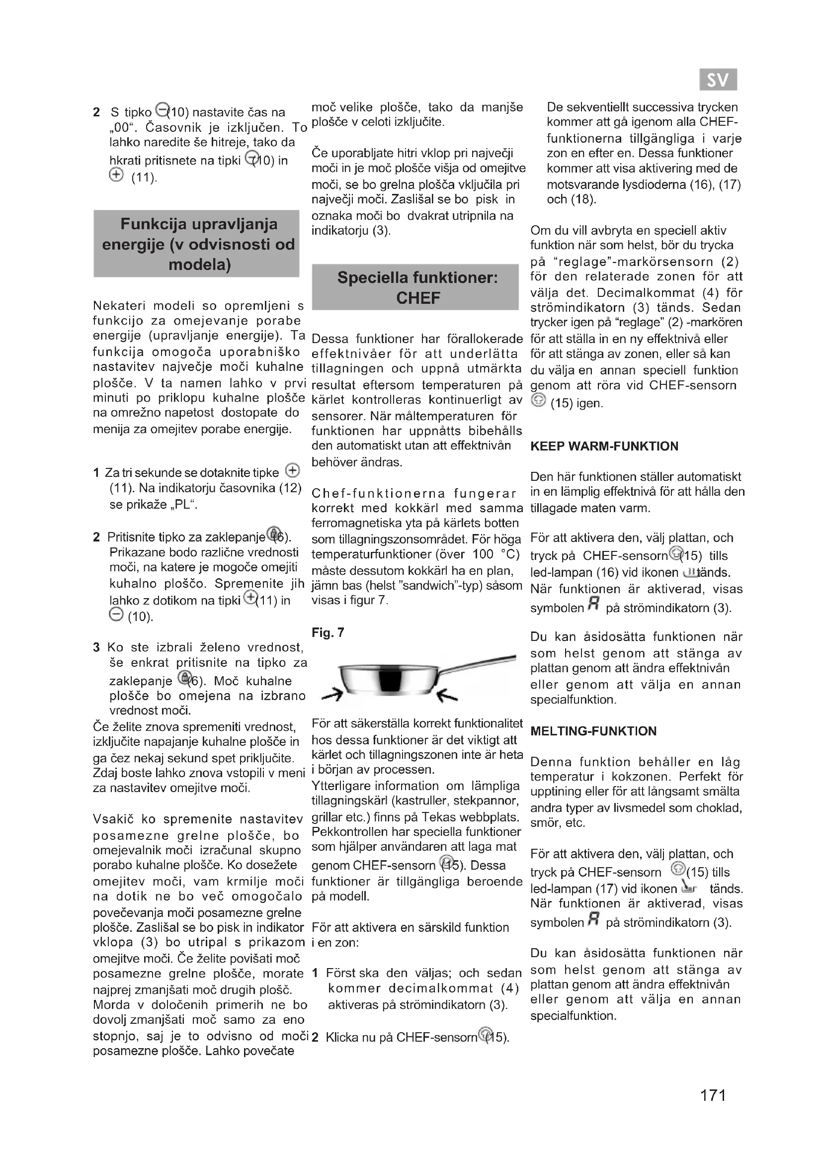 2 S tipko (10) nastavite čas na „00“. Časovnik je izključen. To lahko naredite še hitreje, tako da hkrati pritisnete na tipki (10) in (11). Funkcija upravljanja energije (v odvisnosti od modela) Nekateri modeli so opremljeni s funkcijo za omejevanje porabe energije (upravljanje energije). Ta funkcija omogoča uporabniško nastavitev največje moči kuhalne plošče. V ta namen lahko v prvi minuti po priklopu kuhalne plošče na omrežno napetost dostopate do menija za omejitev porabe energije. 1 Za tri sekunde se dotaknite tipke (11). Na indikatorju časovnika (12) se prikaže „PL“. 2 Pritisnite tipko za zaklepanje (6). Prikazane bodo različne vrednosti moči, na katere je mogoče omejiti kuhalno ploščo. Spremenite jih lahko z dotikom na tipki (11) in (10). 3 Ko ste izbrali želeno vrednost, še enkrat pritisnite na tipko za zaklepanje (6). Moč kuhalne plošče bo omejena na izbrano vrednost moči. Če želite znova spremeniti vrednost, izključite napajanje kuhalne plošče in ga čez nekaj sekund spet priključite. Zdaj boste lahko znova vstopili v meni za nastavitev omejitve moči. Vsakič ko spremenite nastavitev posamezne grelne plošče, bo omejevalnik moči izračunal skupno porabo kuhalne plošče. Ko dosežete omejitev moči, vam krmilje moči na dotik ne bo več omogočalo povečevanja moči posamezne grelne plošče. Zaslišal se bo pisk in indikator vklopa (3) bo utripal s prikazom omejitve moči. Če želite povišati moč posamezne grelne plošče, morate najprej zmanjšati moč drugih plošč. Morda v določenih primerih ne bo dovolj zmanjšati moč samo za eno stopnjo, saj je to odvisno od moči posamezne plošče. Lahko povečate moč velike plošče, tako da manjše plošče v celoti izključite. Če uporabljate hitri vklop pri največji moči in je moč plošče višja od omejitve moči, se bo grelna plošča vključila pri največji moči. Zaslišal se bo pisk in oznaka moči bo dvakrat utripnila na indikatorju (3). Speciella funktioner: CHEF Dessa funktioner har förallokerade effektnivåer för att underlätta tillagningen och uppnå utmärkta resultat eftersom temperaturen på kärlet kontrolleras kontinuerligt av sensorer. När måltemperaturen för funktionen har uppnåtts bibehålls den automatiskt utan att eektnivån behöver ändras. Chef-funktionerna fungerar korrekt med kokkärl med samma ferromagnetiska yta på kärlets botten som tillagningszonsområdet. För höga temperaturfunktioner (över 100 °C) måste dessutom kokkärl ha en plan, jämn bas (helst ”sandwich”-typ) såsom visas i gur 7. Fig. 7 För att säkerställa korrekt funktionalitet hos dessa funktioner är det viktigt att kärlet och tillagningszonen inte är heta i början av processen. Ytterligare information om lämpliga tillagningskärl (kastruller, stekpannor, grillar etc.) nns på Tekas webbplats. Pekkontrollen har speciella funktioner som hjälper användaren att laga mat genom CHEF-sensorn (15). Dessa funktioner är tillgängliga beroende på modell. För att aktivera en särskild funktion i en zon: 1 Först ska den väljas; och sedan kommer decimalkommat (4) aktiveras på strömindikatorn (3). 2 Klicka nu på CHEF-sensorn (15). De sekventiellt successiva trycken kommer att gå igenom alla CHEF- funktionerna tillgängliga i varje zon en efter en. Dessa funktioner kommer att visa aktivering med de motsvarande lysdioderna (16), (17) och (18). Om du vill avbryta en speciell aktiv funktion när som helst, bör du trycka på “reglage”-markörsensorn (2) för den relaterade zonen för att välja det. Decimalkommat (4) för strömindikatorn (3) tänds. Sedan trycker igen på “reglage” (2) -markören för att ställa in en ny eektnivå eller för att stänga av zonen, eller så kan du välja en annan speciell funktion genom att röra vid CHEF-sensorn (15) igen. KEEP WARM-FUNKTION Den här funktionen ställer automatiskt in en lämplig eektnivå för att hålla den tillagade maten varm. För att aktivera den, välj plattan, och tryck på CHEF-sensorn (15) tills led-lampan (16) vid ikonen tänds. När funktionen är aktiverad, visas symbolen på strömindikatorn (3). Du kan åsidosätta funktionen när som helst genom att stänga av plattan genom att ändra eektnivån eller genom att välja en annan specialfunktion. MELTING-FUNKTION Denna funktion behåller en låg temperatur i kokzonen. Perfekt för upptining eller för att långsamt smälta andra typer av livsmedel som choklad, smör, etc. För att aktivera den, välj plattan, och tryck på CHEF-sensorn (15) tills led-lampan (17) vid ikonen tänds. När funktionen är aktiverad, visas symbolen på strömindikatorn (3). Du kan åsidosätta funktionen när som helst genom att stänga av plattan genom att ändra eektnivån eller genom att välja en annan specialfunktion.SV