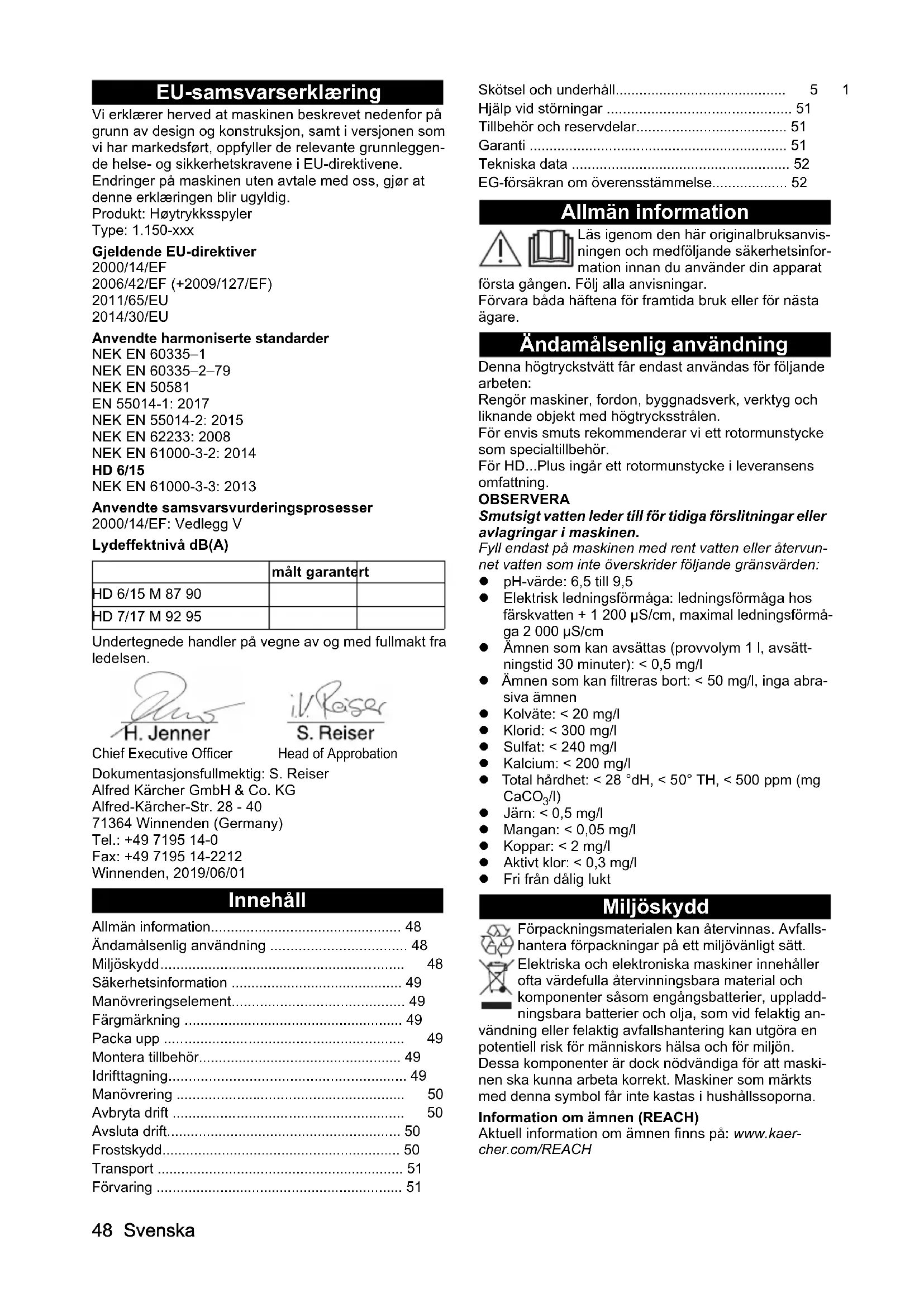 Anvendte samsvarsvurderingsprosesser 2000/14/EF: Vedlegg V Lydeffektnivå dB(A) Undertegnede handler på vegne av og med fullmakt fra ledelsen. Dokumentasjonsfullmektig: S. Reiser Alfred Kärcher GmbH & Co. KG Alfred-Kärcher-Str. 28 - 40 71364 Winnenden (Germany) Tel.: +49 7195 14-0 Fax: +49 7195 14-2212 Winnenden, 2019/06/01 Innehåll Allmän information Läs igenom den här originalbruksanvis- ningen och medföljande säkerhetsinfor- mation innan du använder din apparat första gången. Följ alla anvisningar. Förvara båda häftena för framtida bruk eller för nästa ägare. Ändamålsenlig användning Denna högtryckstvätt får endast användas för följande arbeten: Rengör maskiner, fordon, byggnadsverk, verktyg och liknande objekt med högtrycksstrålen. För envis smuts rekommenderar vi ett rotormunstycke som specialtillbehör. För HD...Plus ingår ett rotormunstycke i leveransens omfattning. OBSERVERA Smutsigt vatten leder till för tidiga förslitningar eller avlagringar i maskinen. Fyll endast på maskinen med rent vatten eller återvun- net vatten som inte överskrider följande gränsvärden: pH-värde: 6,5 till 9,5 Elektrisk ledningsförmåga: ledningsförmåga hos färskvatten + 1 200 µS/cm, maximal ledningsförmå- ga 2 000 µS/cm Ämnen som kan avsättas (provvolym 1 l, avsätt- ningstid 30 minuter): < 0,5 mg/l Ämnen som kan filtreras bort: < 50 mg/l, inga abra- siva ämnen Kolväte: < 20 mg/l Klorid: < 300 mg/l Sulfat: < 240 mg/l Kalcium: < 200 mg/l Total hårdhet: < 28 °dH, < 50° TH, < 500 ppm (mg CaCO