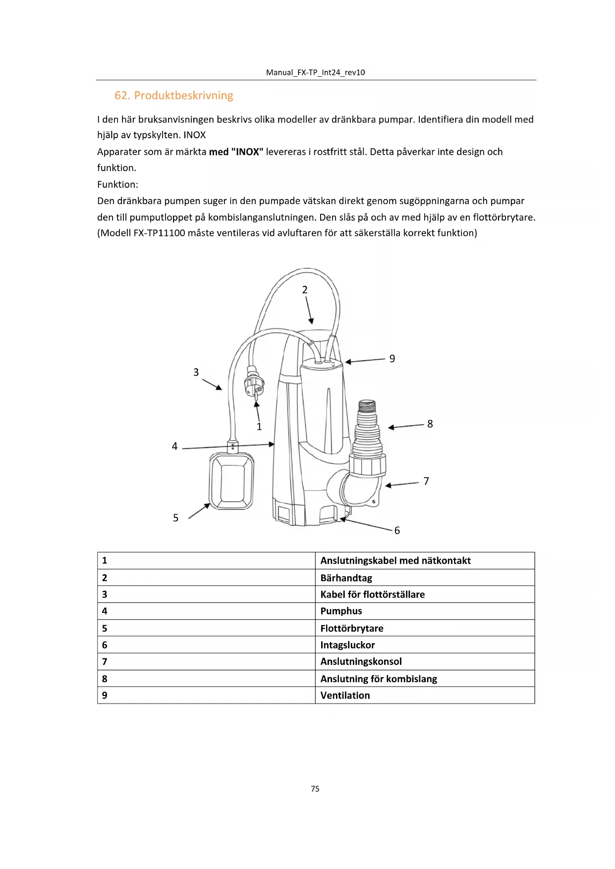 I den här bruksanvisningen beskrivs olika modeller av dränkbara pumpar. Identifiera din modell med hjälp av typskylten. INOX Apparater som är märkta med "INOX" levereras i rostfritt stål. Detta påverkar inte design och funktion. Funktion: Den dränkbara pumpen suger in den pumpade vätskan direkt genom sugöppningarna och pumpar den till pumputloppet på kombislanganslutningen. Den slås på och av med hjälp av en flottörbrytare. (Modell FX-TP11100 måste ventileras vid avluftaren för att säkerställa korrekt funktion)