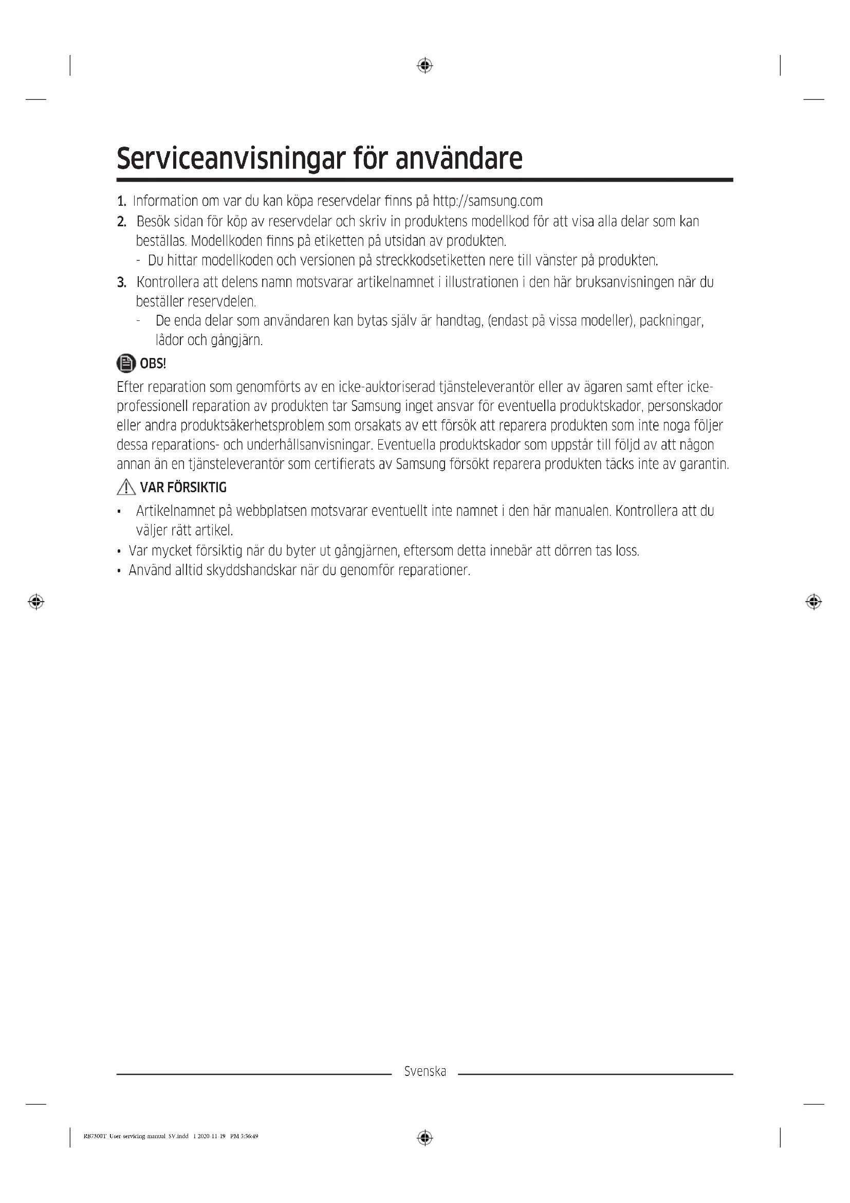beställer reservdelen. - De enda delar som användaren kan bytas själv är handtag, (endast på vissa modeller), packningar, lådor och gångjärn. OBS! Efter reparation som genomförts av en icke-auktoriserad tjänsteleverantör eller av ägaren samt efter icke- professionell reparation av produkten tar Samsung inget ansvar för eventuella produktskador, personskador eller andra produktsäkerhetsproblem som orsakats av ett försök att reparera produkten som inte noga följer dessa reparations- och underhållsanvisningar. Eventuella produktskador som uppstår till följd av att någon annan än en tjänsteleverantör som certierats av Samsung försökt reparera produkten täcks inte av garantin.