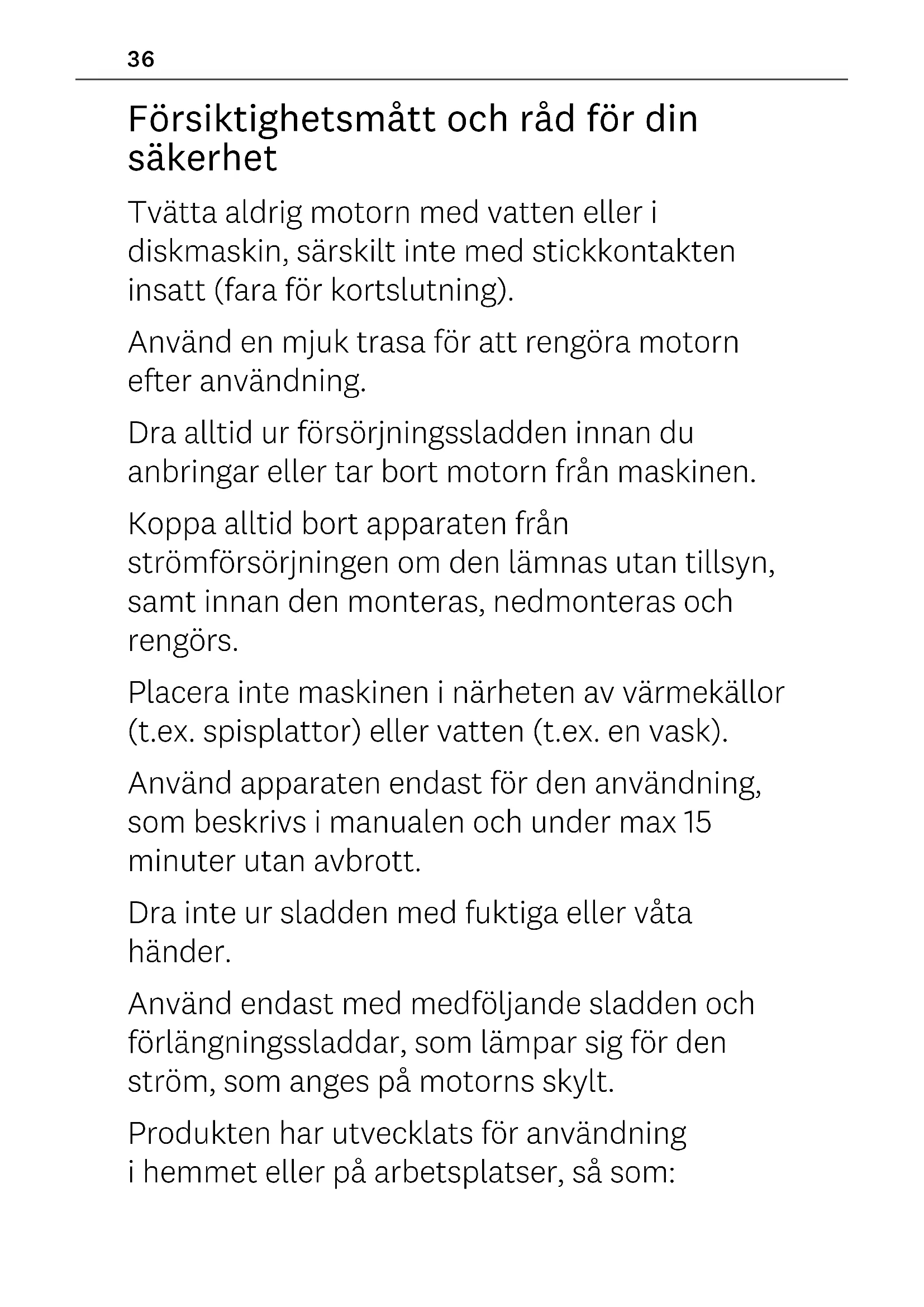 sykäyksittäin, paina painike asentoon II (PULSE). Moottorin irrottamiseksi koneesta käännä sitä ylöspäin noin 30° ja vedä ulospäin (Kuva 5 ). Takuu Marcato-tuotteet on valmistettu parhaita saatavilla olevia materiaaleja käyttämällä ja niiden laatua arvioidaan jatkuvasti. Tämän vuoksi annamme tuotteillemme 2 vuoden takuun valmistusvirheitä vastaan. Takuu ei kata vahinkoja, jotka johtuvat tuotteen väärinkäytöstä tai tässä ohjekirjassa kuvatusta poikkeavasta käytöstä. Lisätietoja tai reseptejä varten tutustu www.marcato.it tai kirjoita osoitteeseen info@marcato.it Lataa nämä tiedot www.marcato.it SUOMI36 Försiktighetsmått och råd för din säkerhet Tvätta aldrig motorn med vatten eller i diskmaskin, särskilt inte med stickkontakten insatt (fara för kortslutning). Använd en mjuk trasa för att rengöra motorn efter användning. Dra alltid ur försörjningssladden innan du anbringar eller tar bort motorn från maskinen. Koppa alltid bort apparaten från strömförsörjningen om den lämnas utan tillsyn, samt innan den monteras, nedmonteras och rengörs. Placera inte maskinen i närheten av värmekällor (t.ex. spisplattor) eller vatten (t.ex. en vask). Använd apparaten endast för den användning, som beskrivs i manualen och under max 15 minuter utan avbrott. Dra inte ur sladden med fuktiga eller våta händer. Använd endast med medföljande sladden och förlängningssladdar, som lämpar sig för den ström, som anges på motorns skylt. Produkten har utvecklats för användning i hemmet eller på arbetsplatser, så som:37SVENSKA områden med köksutrustning i aärer, på kontor eller andra arbetsplatser, hotell och andra turiststrukturer, restaurangkök. Under arbete med motorförsedda maskiner ska du undvika att bära slips, halsduk eller långa halsband. Kom ihåg att sätta upp håret. Rengöring och underhåll får inte utföras av barn, om de inte står under strikt tillsyn av en vuxen. All reparation, som involverar elektriska komponenter, ska utföras av kvalificerad personal. Det är förbjudet för ej auktoriserad personal att få åtkomst till motorns inre delar. VARNING! Apparaten kan användas av barn från 8 år och uppåt om de övervakas eller erhållit instruktioner om användning av apparaten i säkerhet, samt förstått de risker denna användning medför. Rengöring och underhåll, som utförs av användaren, får inte utföras av barn, om de inte är över 8 år gamla och arbetar under tillsyn. Förvara apparaten och dess sladd utom räckhåll för barn under 8 år. Apparaterna kan användas av personer med nedsatt fysisk, sensorisk och mental kapacitet, eller som saknar erfarenhet och kunskap, om de står under38 övervakning eller om de erhållit instruktioner om användning av apparaten i säkerhet, samt förstått de risker denna användning medför. Barn får inte använda apparaten som leksak. Förekomst av en överkorsad, rörlig behållare anger att produkten är föremål för separat avfallsinsamling efter avslutad livscykel inom den Europeiska Unionen. Produkten får inte bortskaas med hushållsavfall.39 Material i förpackningen