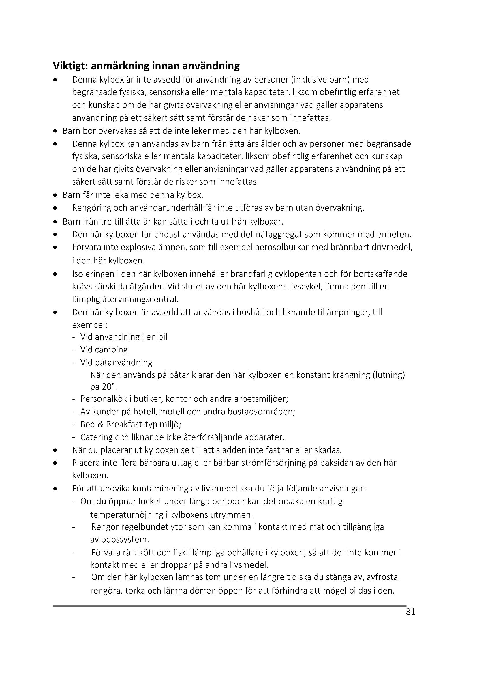 Den har kylboxen ar inte lamplig for transport av fratande material aller material som innehaller losningsmedel. - Använd inte andra elektriska apparater i den här kylboxen om inte det rekommenderas av tillverkaren Förändamålet.