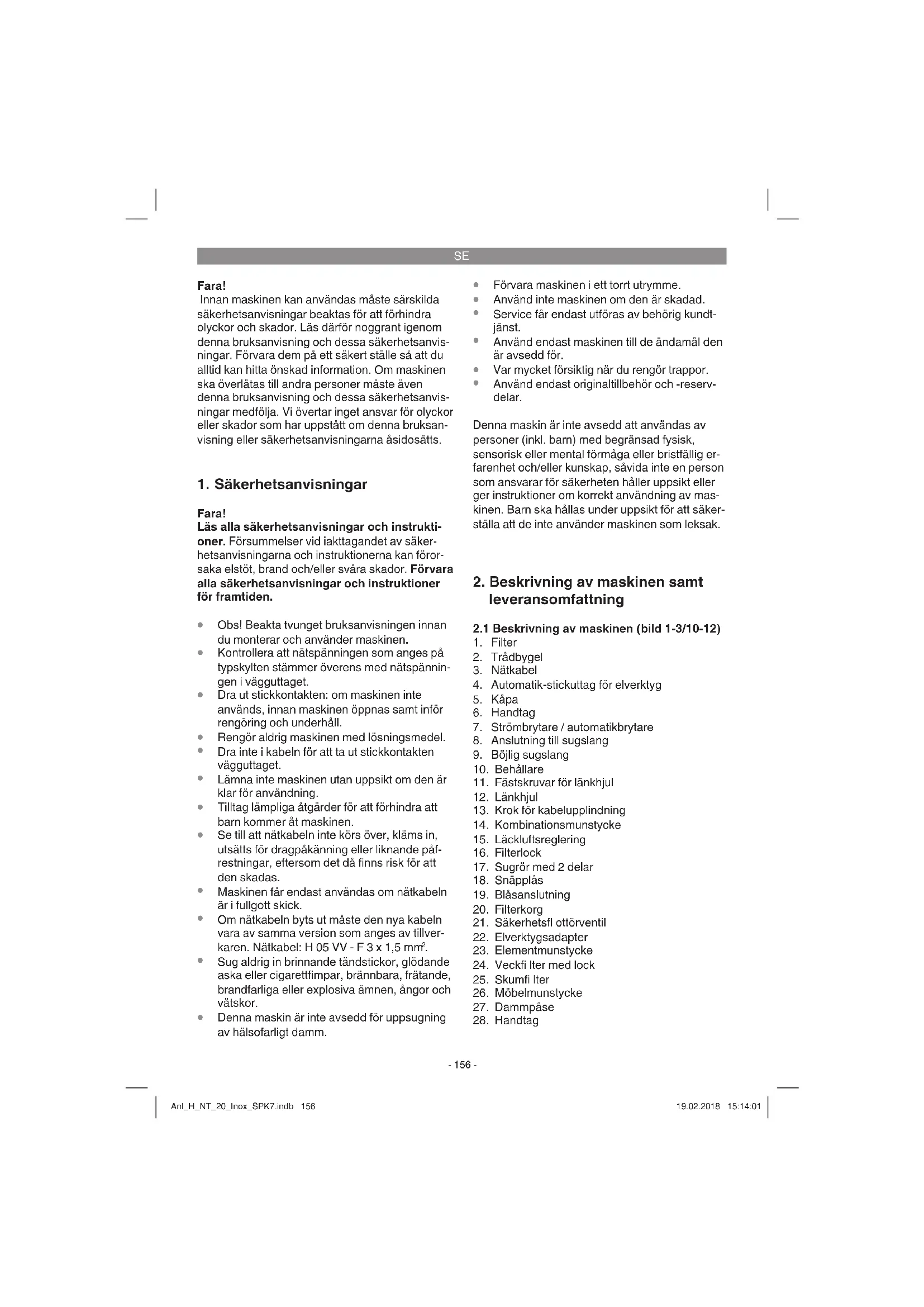 Montera länkhjulen (bild 4/12) Montera länkhjulen (12) enligt beskrivningen i bild 4. Montera trådbygeln för upplindning av kabel och sugslang (bild 5/2) Montera trådbygeln för upplindning av kabel och sugslang enligt beskrivningen i bild 5. Efter att kabeln och sugslangen har använts kan de lindas upp på trådbygeln. Montera sugarens kåpa (bild 6) Sugarens kåpa (5) har fästs vid behållaren (10) med snäpplås (18). För att kåpan (5) ska kunna tas av måste först snäpplåsen (18) öppnas. Där- efter kan kåpan (5) tas av. När sugarens kåpa (5) monteras måste man se till att snäpplåsen (18) hakar in rätt. Anl_H_NT_20_Inox_SPK7.indb 157Anl_H_NT_20_Inox_SPK7.indb 157 19.02.2018 15:14:0119.02.2018 15:14:01SE
