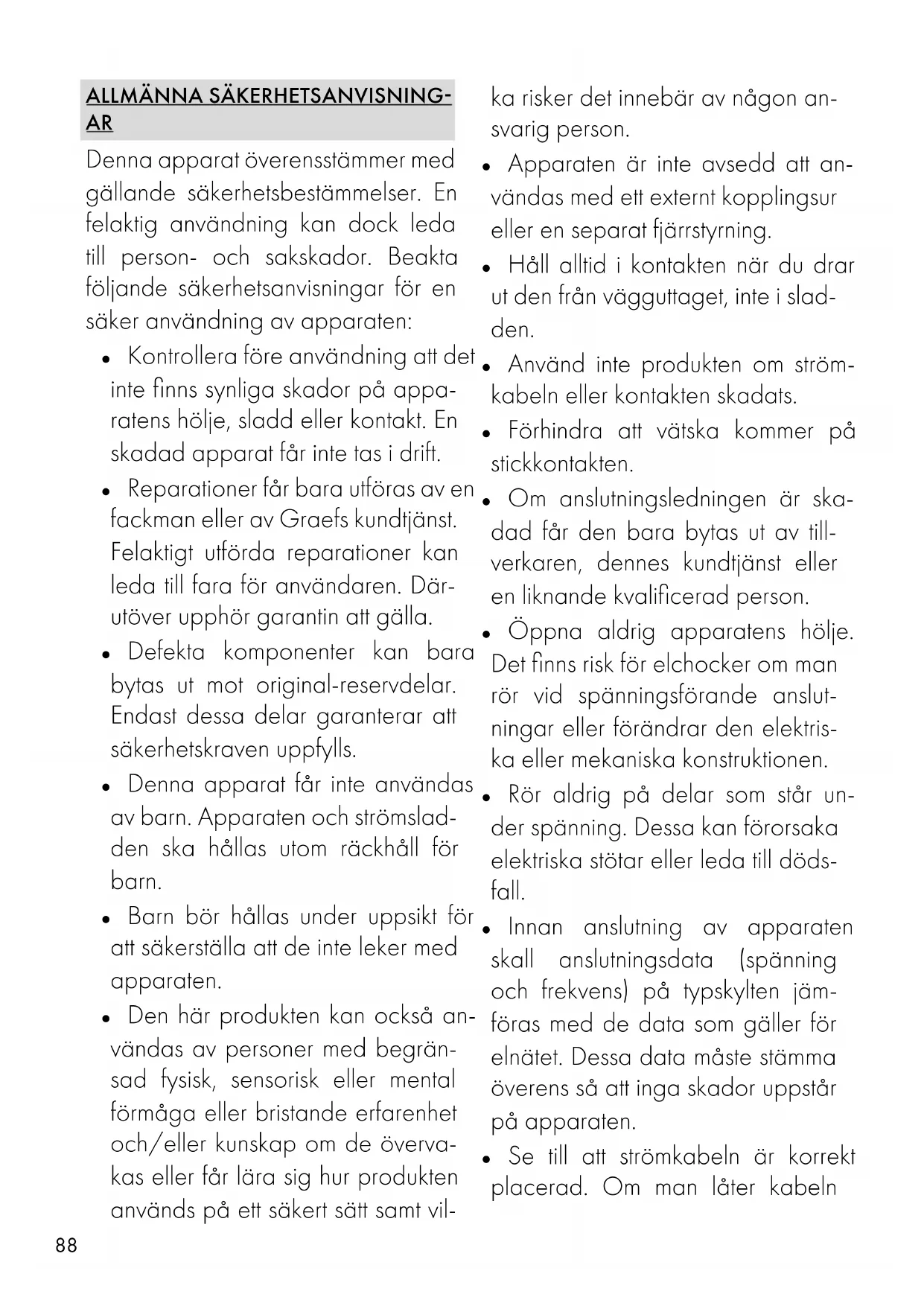 Denna apparat överensstämmer med gällande säkerhetsbestämmelser. En felaktig användning kan dock leda till person- och sakskador. Beakta följande säkerhetsanvisningar för en säker användning av apparaten: ● Kontrollera före användning att det inte finns synliga skador på appa- ratens hölje, sladd eller kontakt. En skadad apparat får inte tas i drift. ● Reparationer får bara utföras av en fackman eller av Graefs kundtjänst. Felaktigt utförda reparationer kan leda till fara för användaren. Där- utöver upphör garantin att gälla. ● Defekta komponenter kan bara bytas ut mot original-reservdelar. Endast dessa delar garanterar att säkerhetskraven uppfylls. ● Denna apparat får inte användas av barn. Apparaten och strömslad- den ska hållas utom räckhåll för barn. ● Barn bör hållas under uppsikt för att säkerställa att de inte leker med apparaten. ● Den här produkten kan också an- vändas av personer med begrän- sad fysisk, sensorisk eller mental förmåga eller bristande erfarenhet och/eller kunskap om de överva- kas eller får lära sig hur produkten används på ett säkert sätt samt vil- ka risker det innebär av någon an- svarig person. ● Apparaten är inte avsedd att an- vändas med ett externt kopplingsur eller en separat fjärrstyrning. ● Håll alltid i kontakten när du drar ut den från vägguttaget, inte i slad- den. ● Använd inte produkten om ström- kabeln eller kontakten skadats. ● Förhindra att vätska kommer på stickkontakten. ● Om anslutningsledningen är ska- dad får den bara bytas ut av till- verkaren, dennes kundtjänst eller en liknande kvalificerad person. ● Öppna aldrig apparatens hölje. Det finns risk för elchocker om man rör vid spänningsförande anslut- ningar eller förändrar den elektris- ka eller mekaniska konstruktionen. ● Rör aldrig på delar som står un- der spänning. Dessa kan förorsaka elektriska stötar eller leda till döds- fall. ● Innan anslutning av apparaten skall anslutningsdata (spänning och frekvens) på typskylten jäm- föras med de data som gäller för elnätet. Dessa data måste stämma överens så att inga skador uppstår på apparaten. ● Se till att strömkabeln är korrekt placerad. Om man låter kabeln89