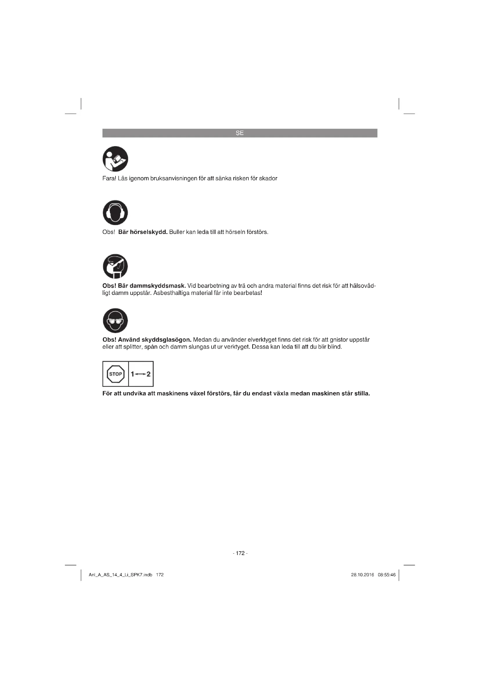 Fara! Läs igenom bruksanvisningen för att sänka risken för skador Obs! Bär hörselskydd. Buller kan leda till att hörseln förstörs. Obs! Använd skyddsglasögon. Medan du använder elverktyget fi nns det risk för att gnistor uppstår eller att splitter, spån och damm slungas ut ur verktyget. Dessa kan leda till att du blir blind. Obs! Bär dammskyddsmask. Vid bearbetning av trä och andra material fi nns det risk för att hälsovåd- ligt damm uppstår. Asbesthaltiga material får inte bearbetas! För att undvika att maskinens växel förstörs, får du endast växla medan maskinen står stilla. Anl_A_AS_14_4_Li_SPK7.indb 172Anl_A_AS_14_4_Li_SPK7.indb 172 28.10.2016 08:55:4628.10.2016 08:55:46SE