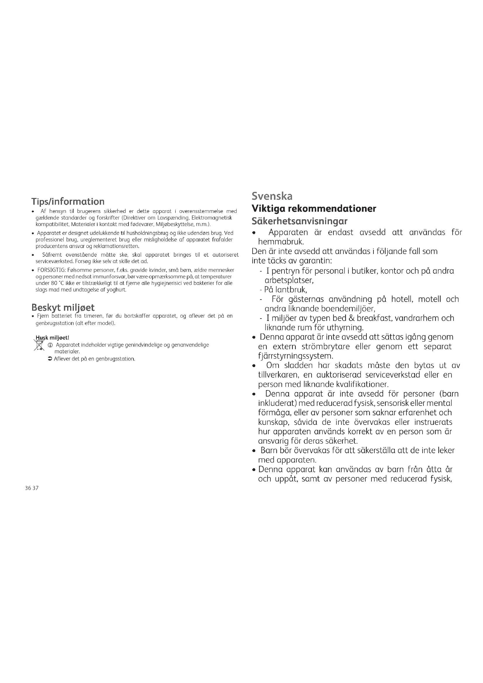 - Innan du kasserar din apparat ska du ta bort batteriet från timern och slänga det på avsedd plats vid närmaste återvinningsstation (beroende på modell). Miljöskydd i första hand! i Din apparat innehåller värdefulla material som kan återanvändas eller återvinnas. Lämna in den på närmaste återvinningscentral. Viktige råd Sikkerhetsinstruksjoner
