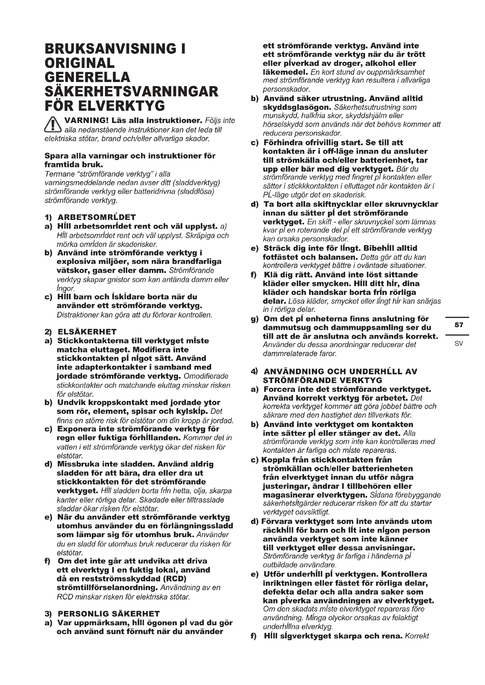 VARNING! Läs alla instruktioner. Följs inte alla nedanstående instruktioner kan det leda till elektriska stötar, brand och/eller allvarliga skador. Spara alla varningar och instruktioner för framtida bruk. Termane “strömförande verktyg” i alla varningsmeddelande nedan avser ditt (sladdverktyg) strömförande verktyg eller batteridrivna (sladdlösa) strömförande verktyg.