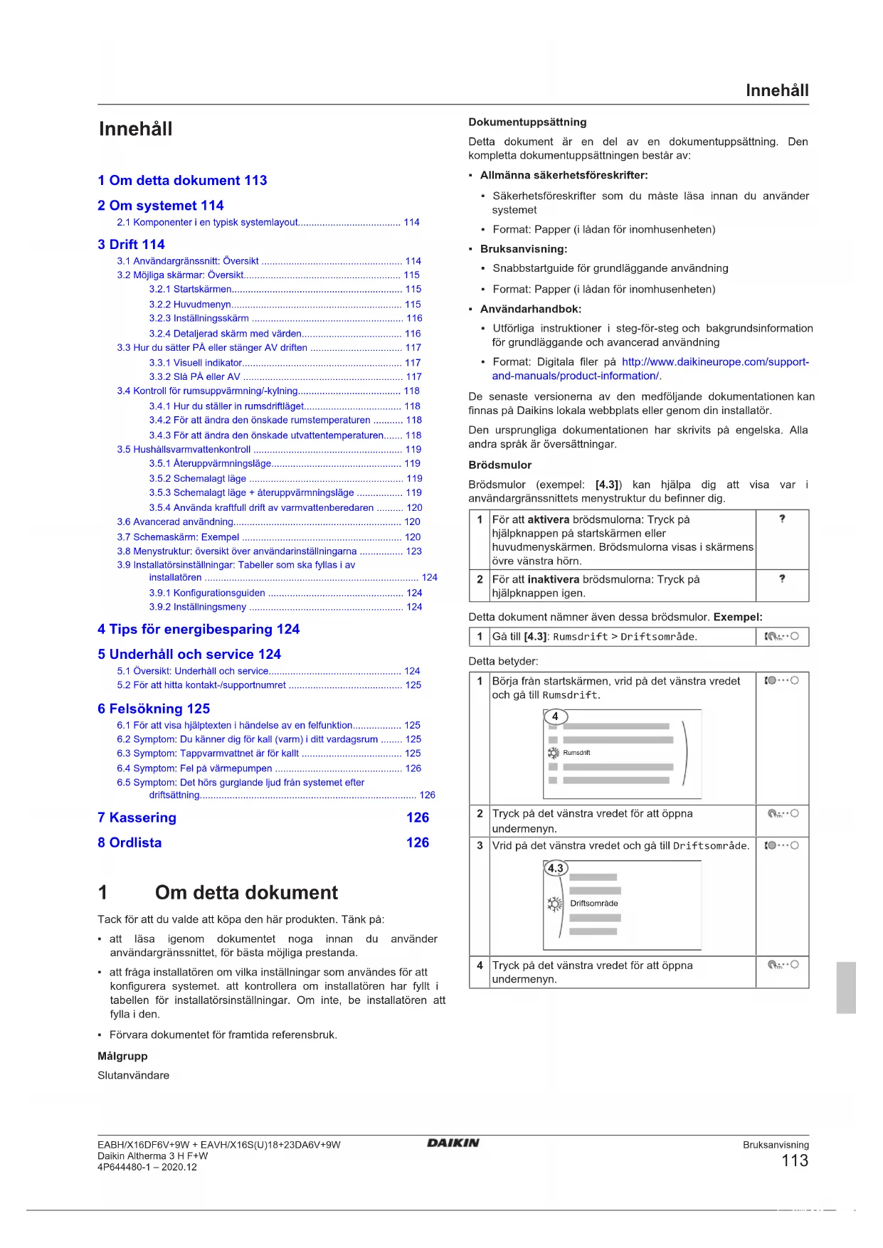 - Format: Digitala filer på http://www.daikineurope.com/support- and-manuals/product-information/. De senaste versionerna av den medföljande dokumentationen kan finnas på Daikins lokala webbplats eller genom din installatör. Den ursprungliga dokumentationen har skrivits på engelska. Alla andra språk är översättningar. Brödsmulor Brödsmulor (exempel: [4.3]) kan hjälpa dig att visa var i användargränssnittets menystruktur du befinner dig. 1 För att aktivera brödsmulorna: Tryck på hjälpknappen på startskärmen eller huvudmenyskärmen. Brödsmulorna visas i skärmens övre vänstra hörn. 2 För att inaktivera brödsmulorna: Tryck på hjälpknappen igen. Detta dokument nämner även dessa brödsmulor. Exempel: 1 Gå till [4.3]: Rumsdrift > Driftsområde. Detta betyder: 1 Börja från startskärmen, vrid på det vänstra vredet och gå till Rumsdrift.