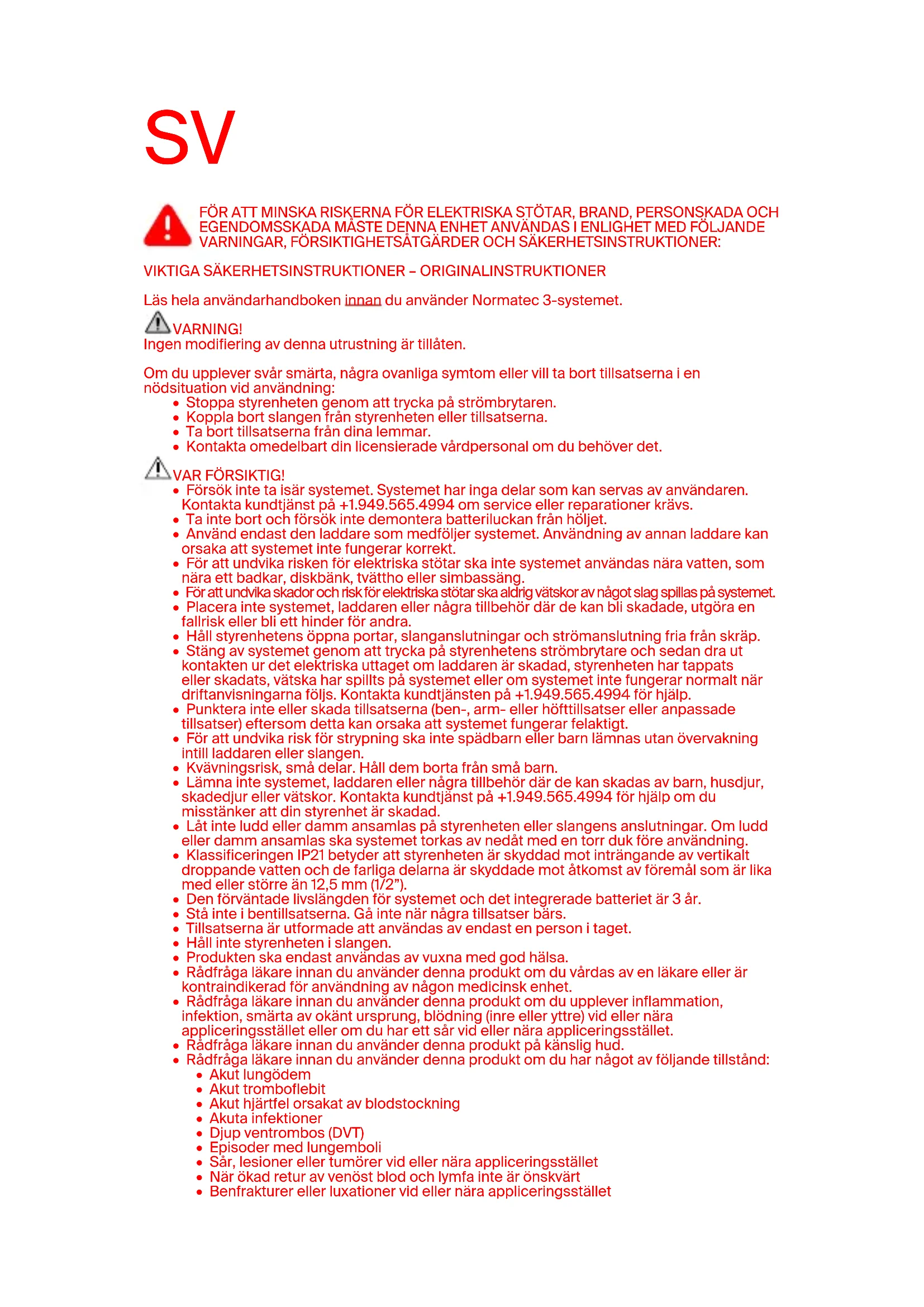 Läs hela användarhandboken innan du använder Normatec 3-systemet. VARNING! Ingen modifiering av denna utrustning är tillåten. Om du upplever svår smärta, några ovanliga symtom eller vill ta bort tillsatserna i en nödsituation vid användning: