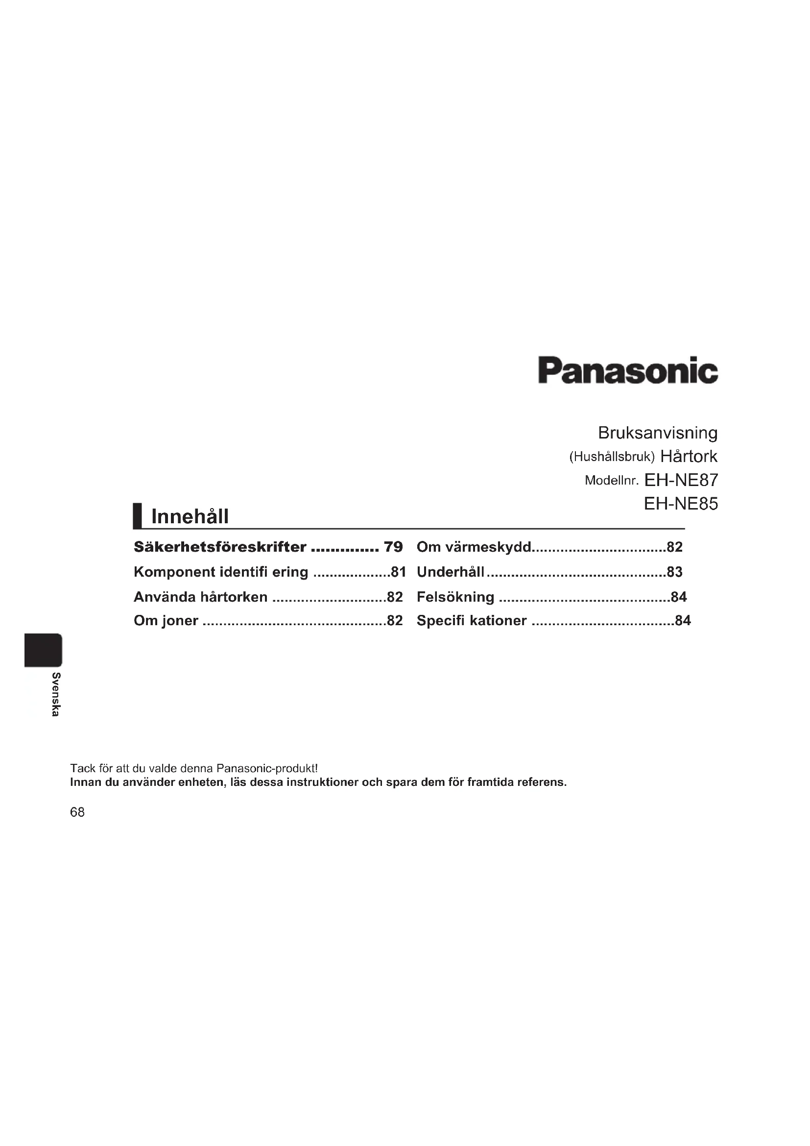 - Effektförbrukning 1 900 W 2 100 W 2 300 W Tillbehör EH-NE87 Munstycke för förstärkt luftflöde, Koncentratormunstycke, Diffusor EH-NE85 Munstycke för förstärkt luftflöde, Koncentratormunstycke Luftburet akustiskt buller 83 (dB(A) re 1 pW) Den här produkten är endast avsedd för hushållsanvändning.76 Svenska Avfallshantering av produkter Endast för Europeiska Unionen och länder med återvinningssystem Denna symbol på produkter, förpackningar och/eller medföljande dokument betyder att förbrukade elektriska och elektroniska produkter inte får blandas med vanliga hushållssopor. För att gamla produkter ska hanteras och återvinnas på rätt sätt ska dom lämnas till passande uppsamlingsställe i enlighet med nationella bestämmelser. Genom att sortera korrekt hjälper du till att spara värdefulla resurser och förhindrar eventuella negativa effekter på människors hälsa och på miljön. För mer information om insamling och återvinning kontakta din kommun. Olämplig avfallshantering kan beläggas med böter i enlighet med nationella bestämmelser. Auktoriserad representant i EU: Panasonic Marketing Europe GmbH Panasonic Testing Centre Winsbergring 15, 22525 Hamburg, Tyskland Importör: Panasonic Marketing Europe GmbH Hagenauer Strasse 43, 65203 Wiesbaden, Tyskland Tillverkad av: Panasonic Corporation 1006, Oaza Kadoma, Kadoma City, Osaka, Japan77 Dansk Brugsvejledning (Husholdningsbrug) Hårtørrer Modelnummer EH-NE87 EH-NE85 Tak, fordi du har købt et Panasonic-produkt. Før du tager produktet i brug, skal du læse denne vejledning og gemme den til fremtidig brug. Sikkerhedsforanstaltninger p. 78