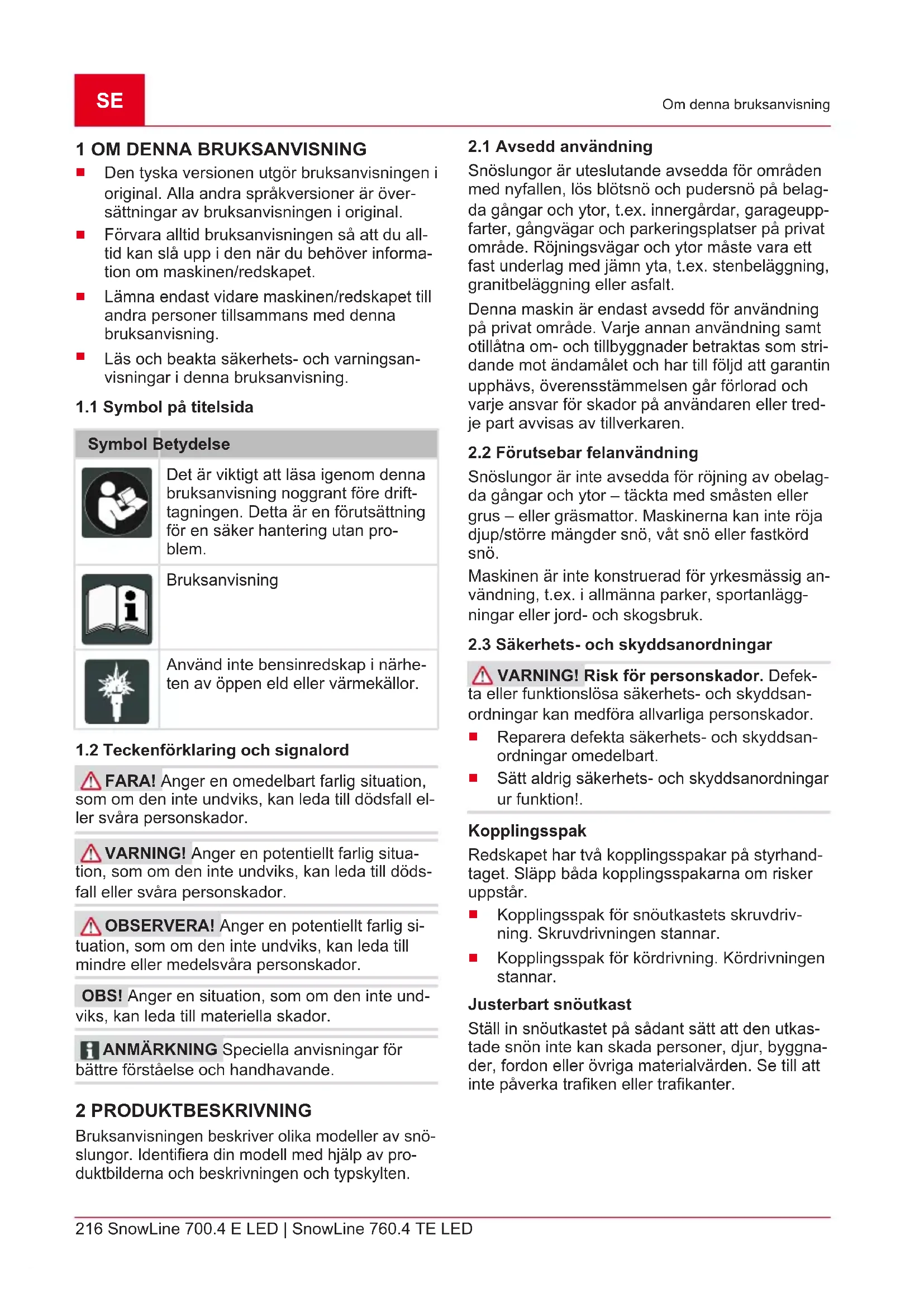 FARA! Anger en omedelbart farlig situation, som om den inte undviks, kan leda till dödsfall el- ler svåra personskador. VARNING! Anger en potentiellt farlig situa- tion, som om den inte undviks, kan leda till döds- fall eller svåra personskador. OBSERVERA! Anger en potentiellt farlig si- tuation, som om den inte undviks, kan leda till mindre eller medelsvåra personskador. OBS! Anger en situation, som om den inte und- viks, kan leda till materiella skador. ANMÄRKNING Speciella anvisningar för bättre förståelse och handhavande. 2 PRODUKTBESKRIVNING Bruksanvisningen beskriver olika modeller av snö- slungor. Identifiera din modell med hjälp av pro- duktbilderna och beskrivningen och typskylten.