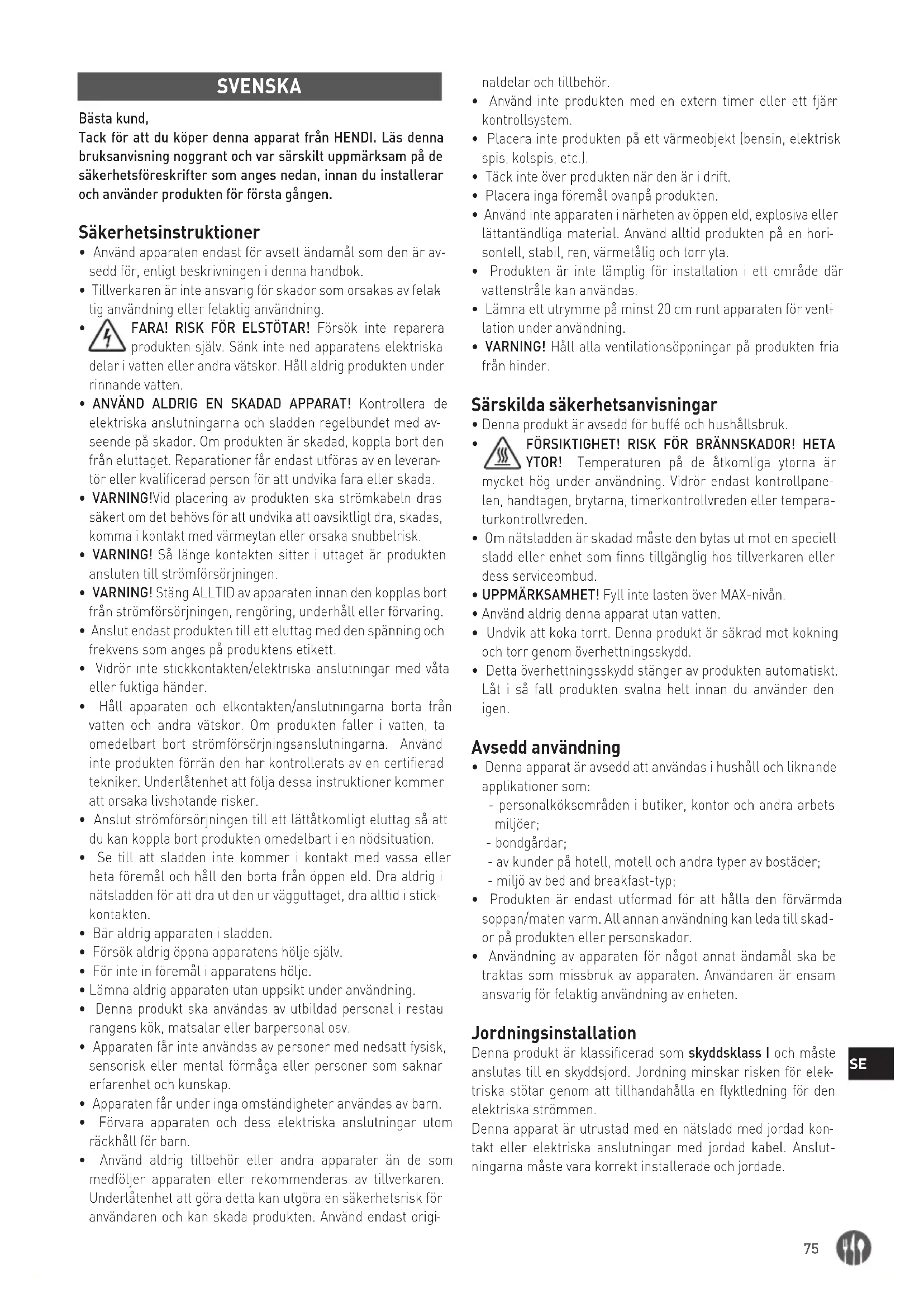 SVENSKA Bästa kund, Tack för att du köper denna apparat från HENDI. Läs denna bruksanvisning noggrant och var särskilt uppmärksam på de säkerhetsföreskrifter som anges nedan, innan du installerar och använder produkten för första gången. Säkerhetsinstruktioner