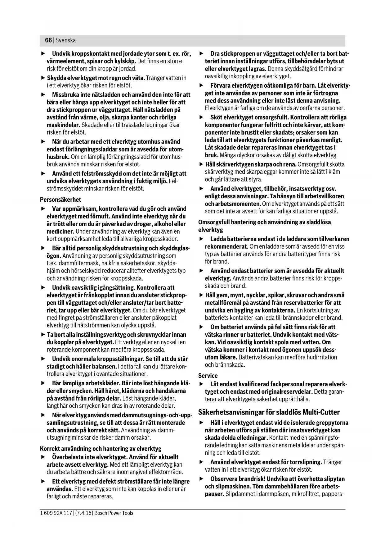- i relation till använt batteri** Begränsad effekt vid temperaturer <0 °CTekniska data baserade på medlevererad batterimodul. OBJ_BUCH-1808-002.book Page 67 Tuesday, April 7, 2015 4:33 PM68 | Svenska 1 609 92A 117 | (7.4.15) Bosch Power Tools Buller-/vibrationsdata Bullernivåvärde förmedlas enligt EN 60745-2-4. Maskinens A-vägda ljudnivå uppnår i typiska fall: Ljudtryck- snivå 80 dB(A); ljudeffektnivå 91 dB(A). Onoggrannhet K=3dB. Använd hörselskydd! Totala vibrationsemissionsvärden a