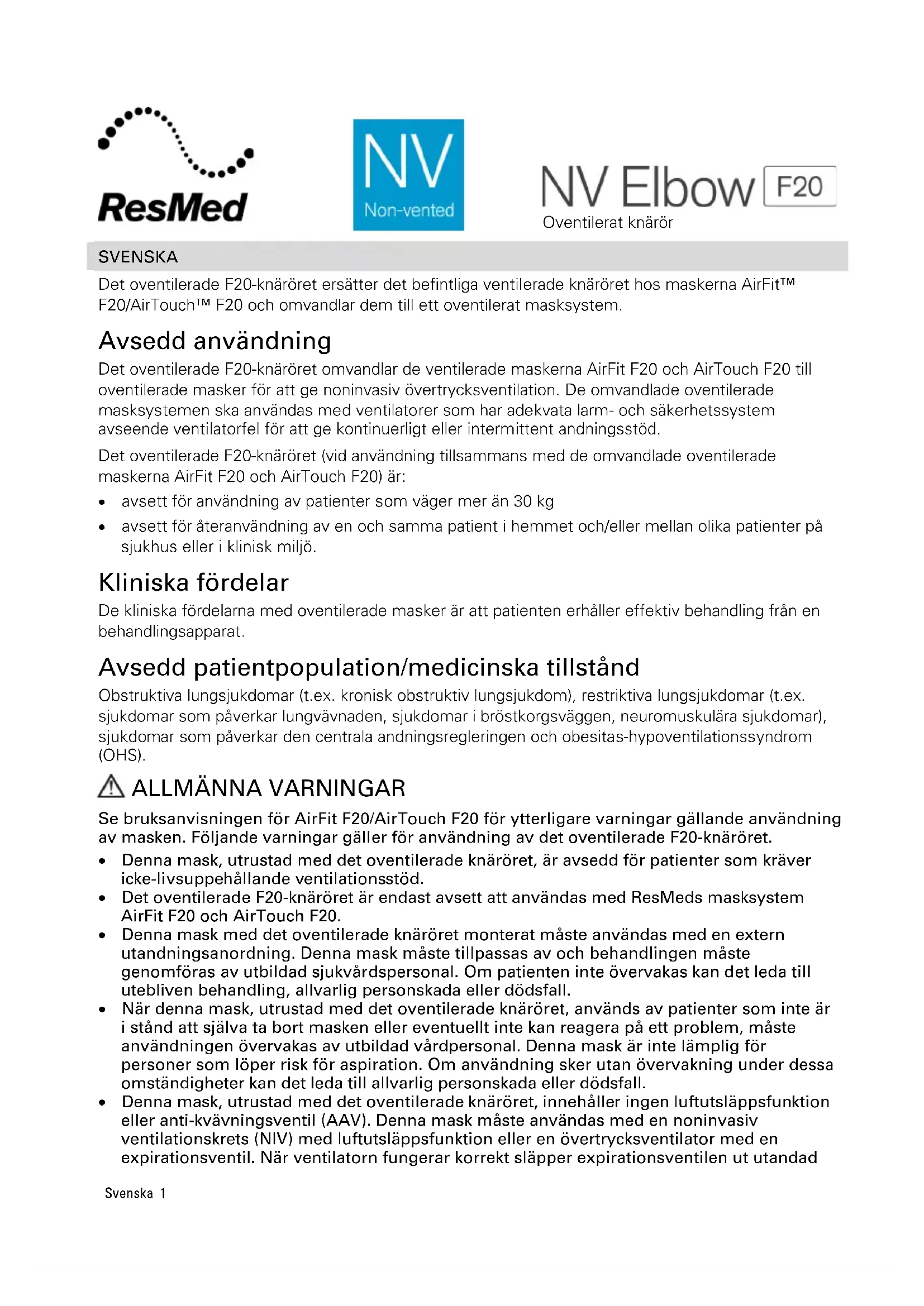 Oventilerat knärör SVENSKA Det oventilerade F20-knäröret ersätter det befintliga ventilerade knäröret hos maskerna AirFit™ F20/AirTouch™ F20 och omvandlar dem till ett oventilerat masksystem. Avsedd användning Det oventilerade F20-knäröret omvandlar de ventilerade maskerna AirFit F20 och AirTouch F20 till oventilerade masker för att ge noninvasiv övertrycksventilation. De omvandlade oventilerade masksystemen ska användas med ventilatorer som har adekvata larm- och säkerhetssystem avseende ventilatorfel för att ge kontinuerligt eller intermittent andningsstöd. Det oventilerade F20-knäröret (vid användning tillsammans med de omvandlade oventilerade maskerna AirFit F20 och AirTouch F20) är:
