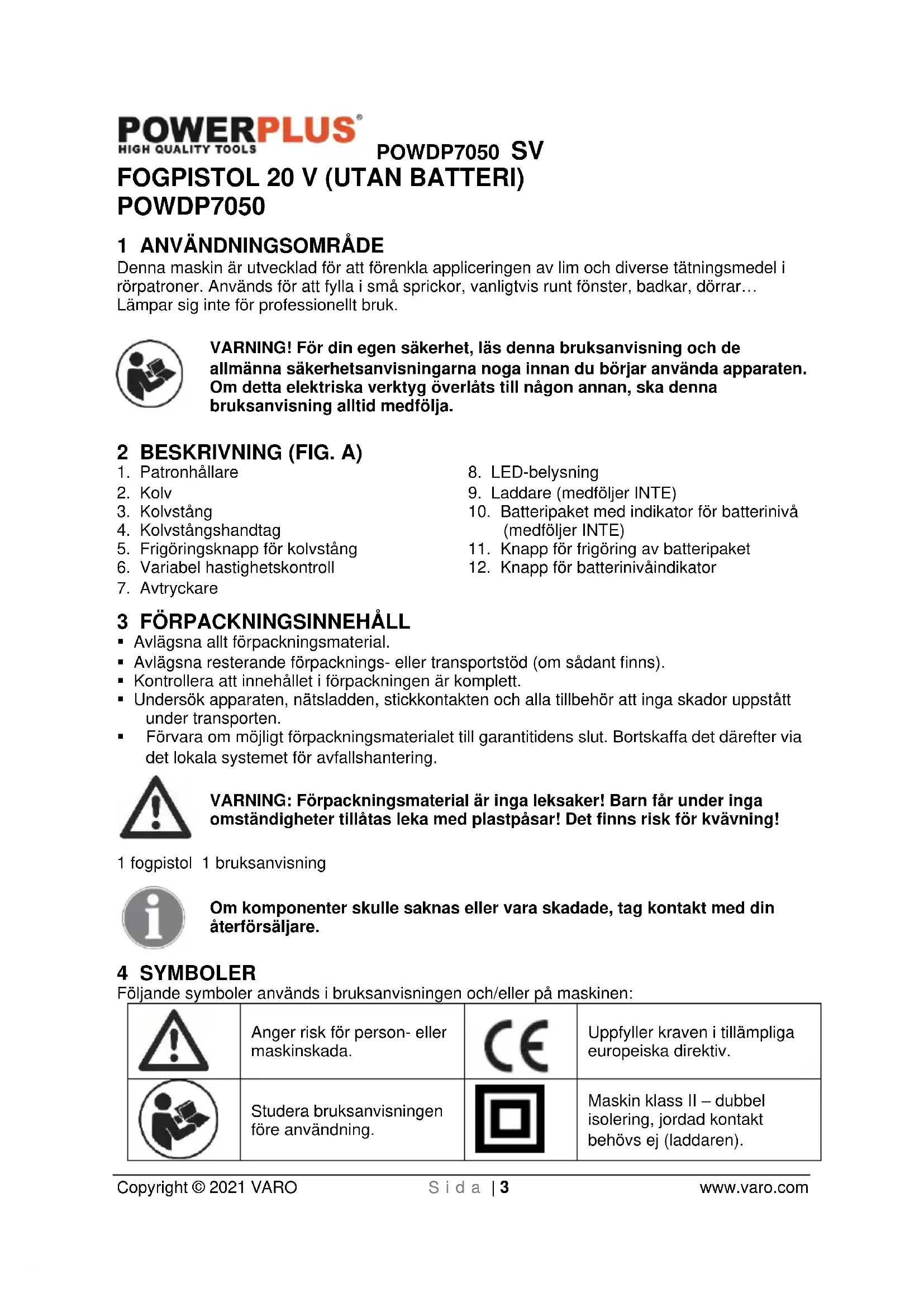 Då produkten tjänat ut får den inte lämnas med det vanliga hushållsavfallet utan ska deponeras på miljömässigt korrekt sätt och enligt gällande lokala bestämmelser. Avfall som kommer från elektriska maskinkomponenter får inte hanteras som vanligt hushållsavfall. De ska deponeras för återvinning där återvinningscentraler finns att tillgå. Kontakta lokala myndigheter eller din återförsäljare för närmare information om återvinning.POWDP7050 SV Copyright © 2021 VARO S i d a | 11 www.varo.com