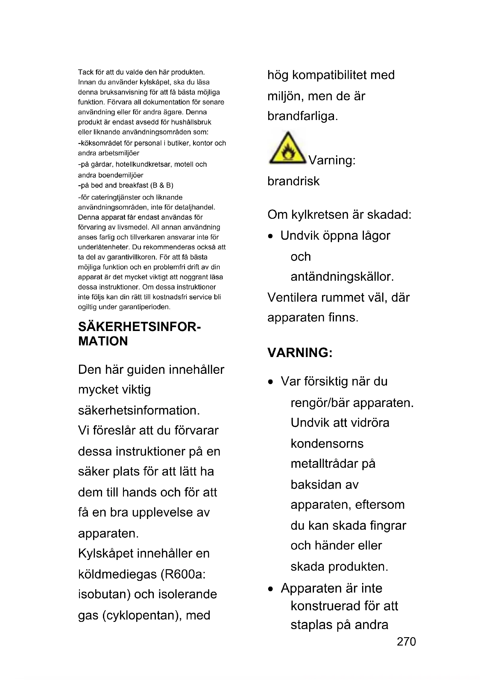 - Fjern støv på bagsiden af apparatet Merci d'avoir acheté ce produit. Avant d'utiliser votre réfrigérateur, veuillez lire attentivement ce mode d'emploi afin d'optimiser sa performance. Conserver l'ensemble de la documentation pour un usage ultérieur ou pour d'autres propriétaires. Ce produit est conçu uniquement pour une270 Tack för att du valde den här produkten. Innan du använder kylskåpet, ska du läsa denna bruksanvisning för att få bästa möjliga funktion. Förvara all dokumentation för senare användning eller för andra ägare. Denna produkt är endast avsedd för hushållsbruk eller liknande användningsområden som: -köksområdet för personal i butiker, kontor och andra arbetsmiljöer -på gårdar, hotellkundkretsar, motell och andra boendemiljöer -på bed and breakfast (B & B) -för cateringtjänster och liknande användningsområden, inte för detaljhandel. Denna apparat får endast användas för förvaring av livsmedel. All annan användning anses farlig och tillverkaren ansvarar inte för underlåtenheter. Du rekommenderas också att ta del av garantivillkoren. För att få bästa möjliga funktion och en problemfri drift av din apparat är det mycket viktigt att noggrant läsa dessa instruktioner. Om dessa instruktioner inte följs kan din rätt till kostnadsfri service bli ogiltig under garantiperioden. SÄKERHETSINFOR- MATION Den här guiden innehåller mycket viktig säkerhetsinformation. Vi föreslår att du förvarar dessa instruktioner på en säker plats för att lätt ha dem till hands och för att få en bra upplevelse av apparaten. Kylskåpet innehåller en köldmediegas (R600a: isobutan) och isolerande gas (cyklopentan), med hög kompatibilitet med miljön, men de är brandfarliga. Varning: brandrisk Om kylkretsen är skadad: