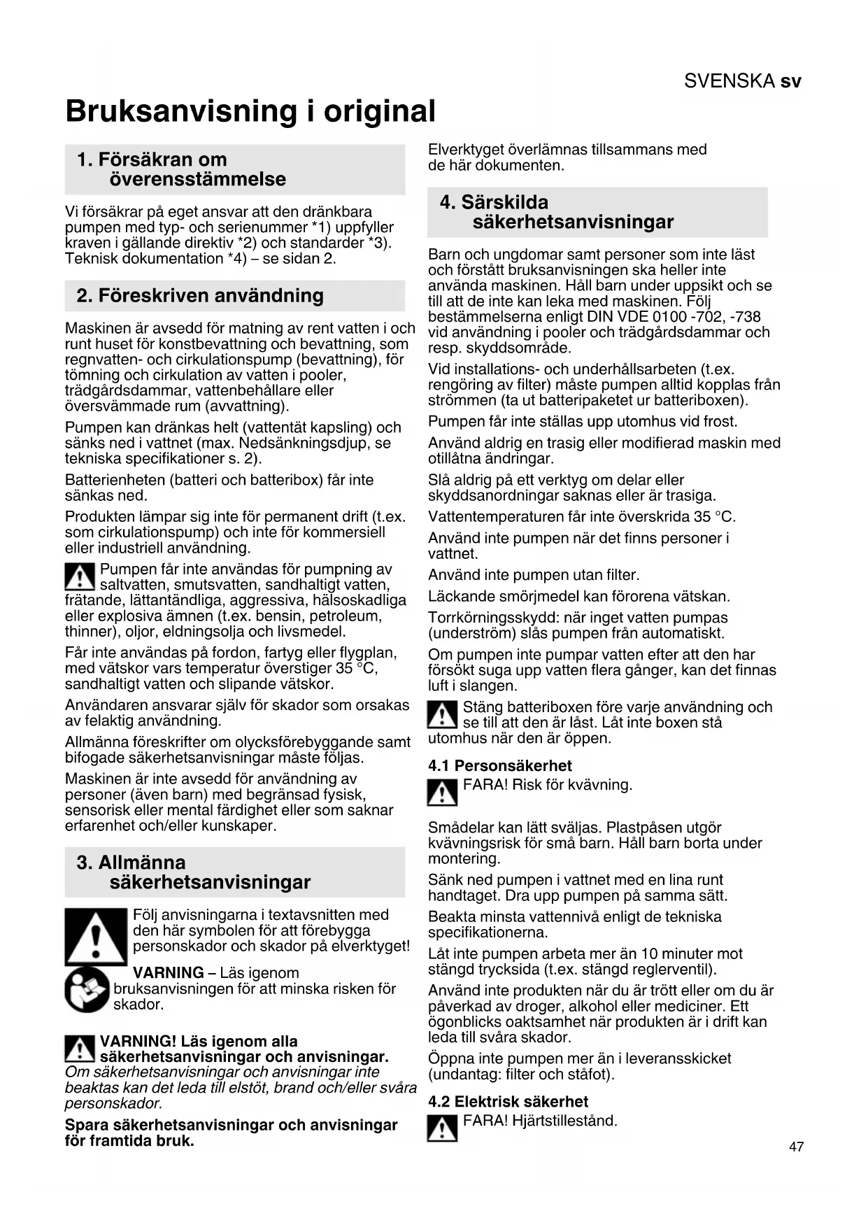 Barn och ungodomar samt personer som inte LAST och forstatt braksanvisingen ske heller inte anvanda maskinen. Häll barn under uppsikt och se till att de inte kan leka med maskinen. Folj bestammelserna enligt DIN VDE 0100 -702, -738 vid användning i pooler och trädgårdsdammar och resp. skyddsomräde.