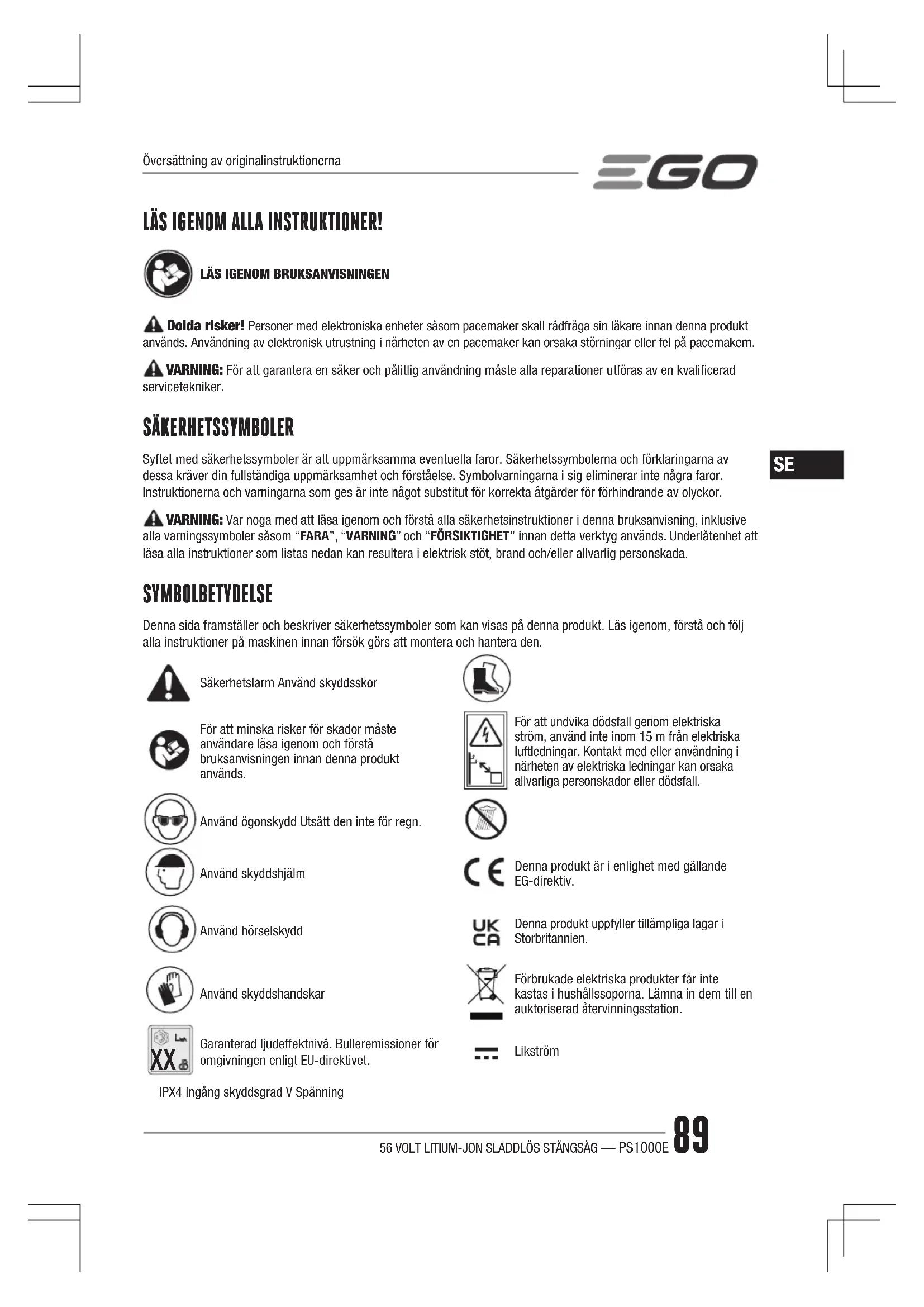 Garanterad ljudeffektnivå. Bulleremissioner för omgivningen enligt EU-direktivet.LikströmIPX4 Ingång skyddsgrad V Spänning56 VOLT LITIUM-JON SLADDLÖS STÅNGSÅG — PS1000E90
