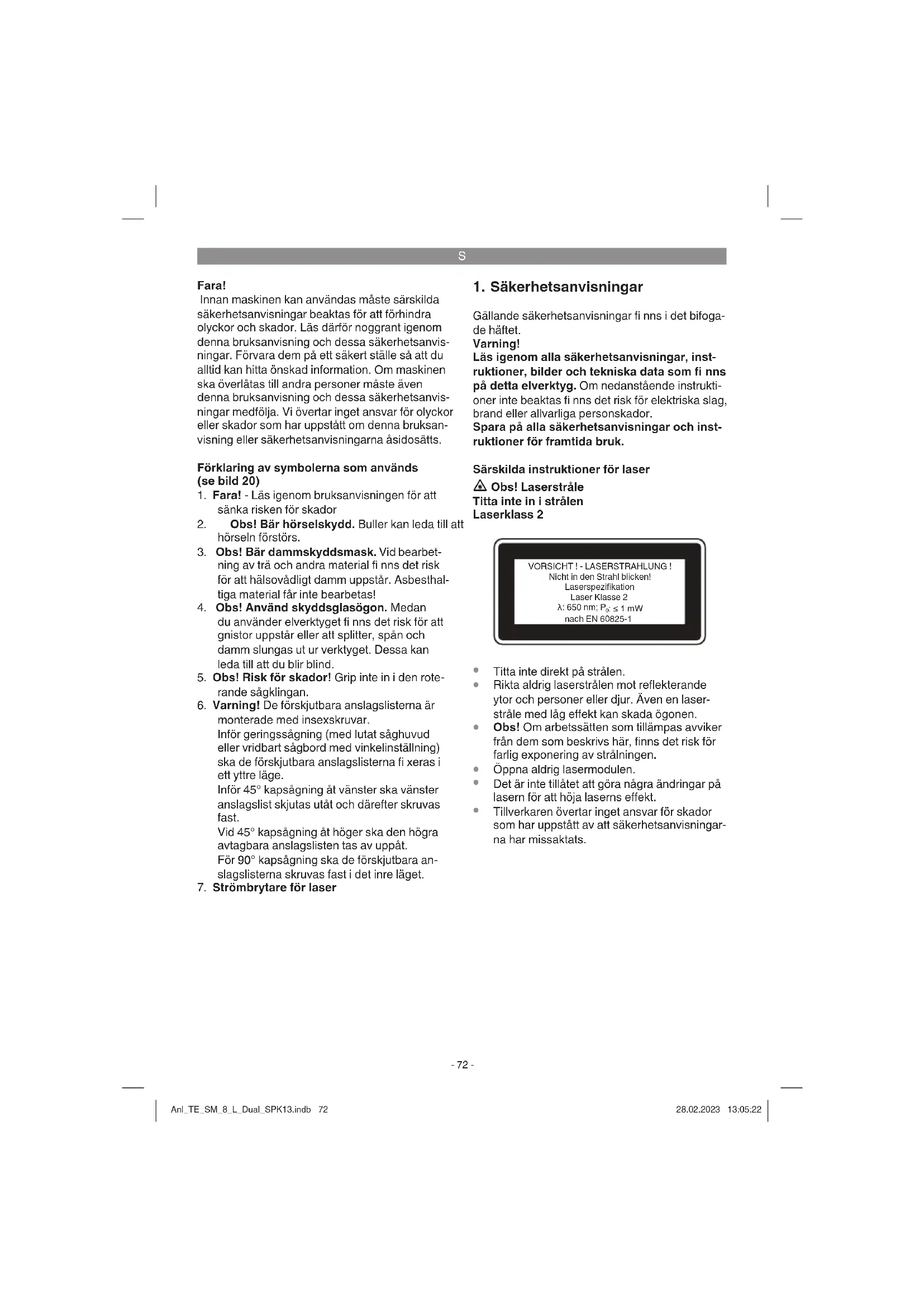 Tillverkaren övertar inget ansvar för skador som har uppstått av att säkerhetsanvisningar- na har missaktats. Anl_TE_SM_8_L_Dual_SPK13.indb 72Anl_TE_SM_8_L_Dual_SPK13.indb 72 28.02.2023 13:05:2228.02.2023 13:05:22S