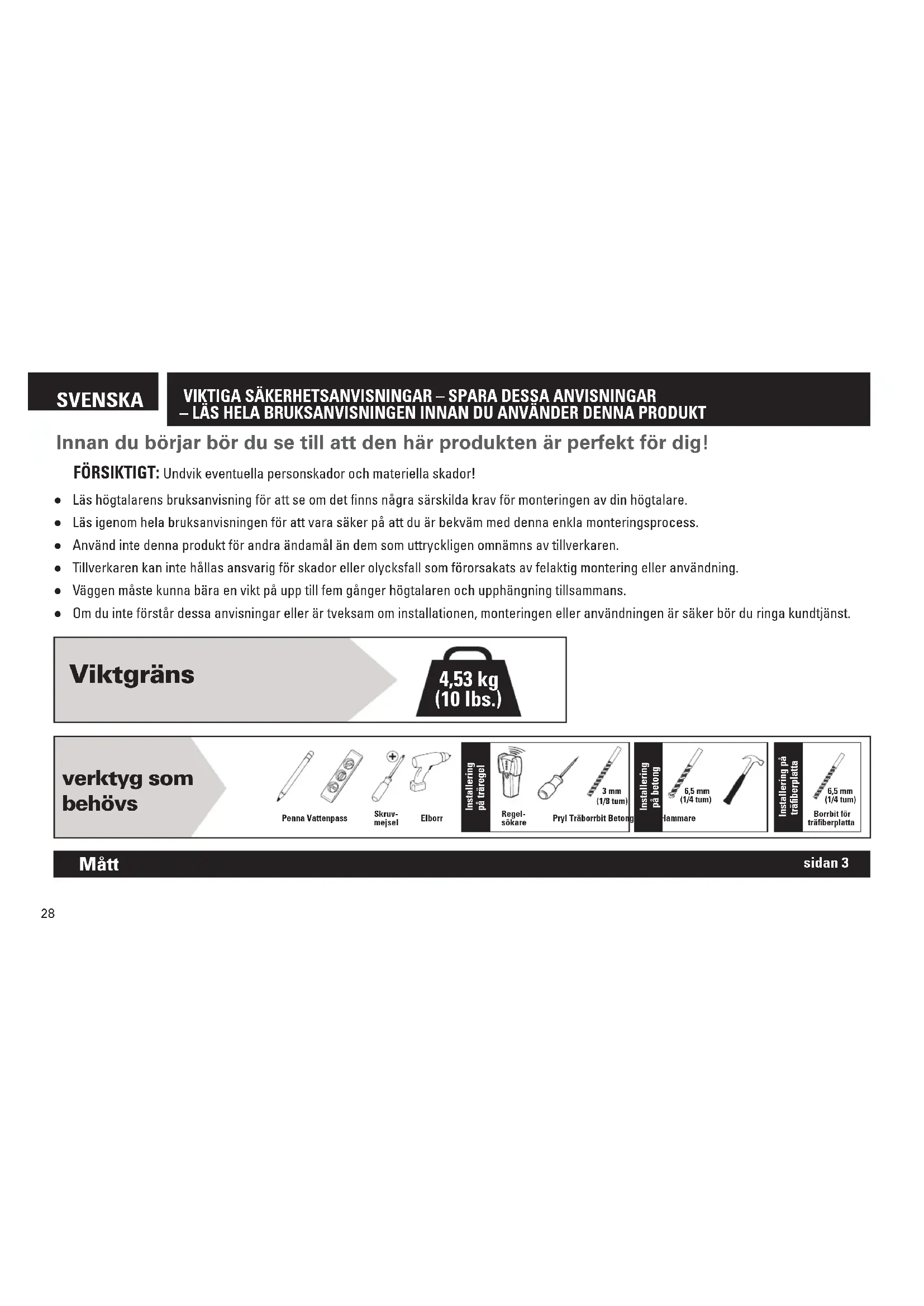 | Lastkapacitet | Upp till 4,5 kg per högtalare. |