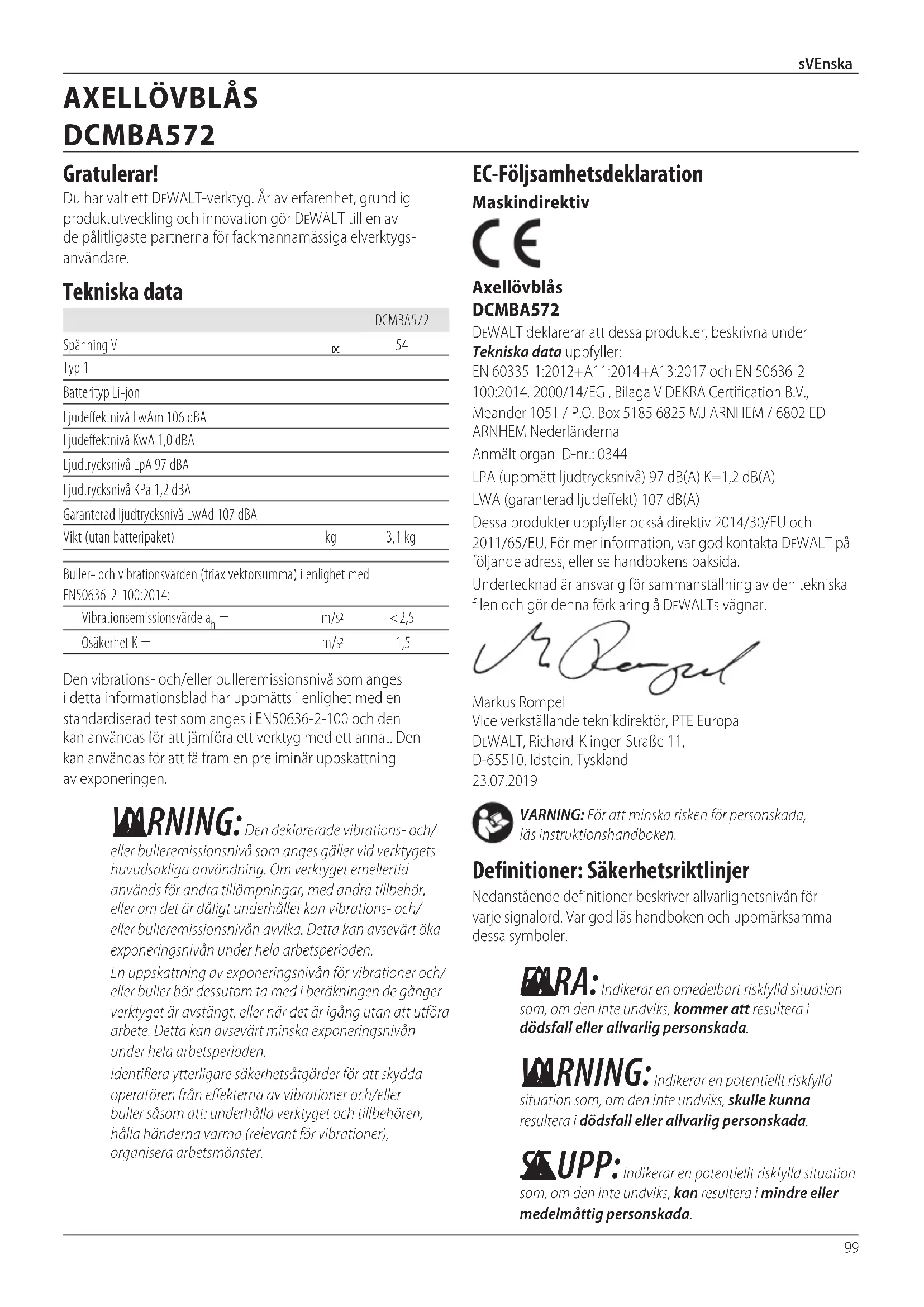 SE UPP: Indikerar en potentiellt riskfylld situation som, om den inte undviks, kan resultera i mindre eller medelmåttigpersonskada. EC-Följsamhetsdeklaration Maskindirektiv Axellövblås DCMBA572 DeWALT deklarerar att dessa produkter, beskrivna under Tekniska data uppfyller: EN 60335-1:2012+A11:2014+A13:2017 och EN 50636-2-100:2014. 2000/14/EG , Bilaga V DEKRA Certification B.V., Meander 1051 / P.O. Box 5185 6825 MJ ARNHEM / 6802 ED ARNHEM Nederländerna Anmält organ ID-nr.: 0344 LPA (uppmätt ljudtrycksnivå) 97 dB(A) K=1,2 dB(A)LWA (garanterad ljudeffekt) 107 dB(A)Dessa produkter uppfyller också direktiv 2014/30/EU och 2011/65/EU. För mer information, var god kontakta DeWALT på följande adress, eller se handbokensbaksida.Undertecknad är ansvarig för sammanställning av den tekniska filen och gör denna förklaring å DeWALTsvägnar.Markus Rompel VIce verkställande teknikdirektör, PTE Europa DeWALT, Richard-Klinger-Straße 11, D-65510, Idstein, Tyskland 23.07.2019Den vibrations- och/eller bulleremissionsnivå som anges i detta informationsblad har uppmätts i enlighet med en standardiserad test som anges i EN50636-2-100 och den kan användas för att jämföra ett verktyg med ett annat. Den kan användas för att få fram en preliminär uppskattning avexponeringen.