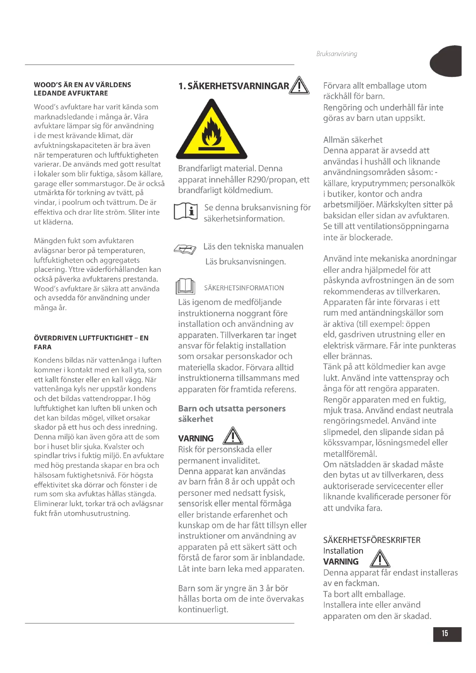 Brandfarligt material. Denna apparat innehåller R290/propan, ett brandfarligt köldmedium. Se denna bruksanvisning för säkerhetsinformation. Läs den tekniska manualen Läs bruksanvisningen. SÄKERHETSINFORMATION Läs igenom de medföljande instruktionerna noggrant före installation och användning av apparaten. Tillverkaren tar inget ansvar för felaktig installation som orsakar personskador och materiella skador. Förvara alltid instruktionerna tillsammans med apparaten för framtida referens. Barn och utsatta personers säkerhet VARNING Risk för personskada eller permanent invaliditet. Denna apparat kan användas av barn från 8 år och uppåt och personer med nedsatt fysisk, sensorisk eller mental förmåga eller bristande erfarenhet och kunskap om de har fått tillsyn eller instruktioner om användning av apparaten på ett säkert sätt och förstå de faror som är inblandade. Låt inte barn leka med apparaten. Barn som är yngre än 3 år bör hållas borta om de inte övervakas kontinuerligt. Förvara allt emballage utom räckhåll för barn. Rengöring och underhåll får inte göras av barn utan uppsikt. Allmän säkerhet Denna apparat är avsedd att användas i hushåll och liknande användningsområden såsom: - källare, kryputrymmen; personalkök i butiker, kontor och andra arbetsmiljöer. Märkskylten sitter på baksidan eller sidan av avfuktaren. Se till att ventilationsöppningarna inte är blockerade. Använd inte mekaniska anordningar eller andra hjälpmedel för att påskynda avfrostningen än de som rekommenderas av tillverkaren. Apparaten får inte förvaras i ett rum med antändningskällor som är aktiva (till exempel: öppen eld, gasdriven utrustning eller en elektrisk värmare. Får inte punkteras eller brännas. Tänk på att köldmedier kan avge lukt. Använd inte vattenspray och ånga för att rengöra apparaten. Rengör apparaten med en fuktig, mjuk trasa. Använd endast neutrala rengöringsmedel. Använd inte slipmedel, den slipande sidan på kökssvampar, lösningsmedel eller metallföremål. Om nätsladden är skadad måste den bytas ut av tillverkaren, dess auktoriserade servicecenter eller liknande kvalicerade personer för att undvika fara.