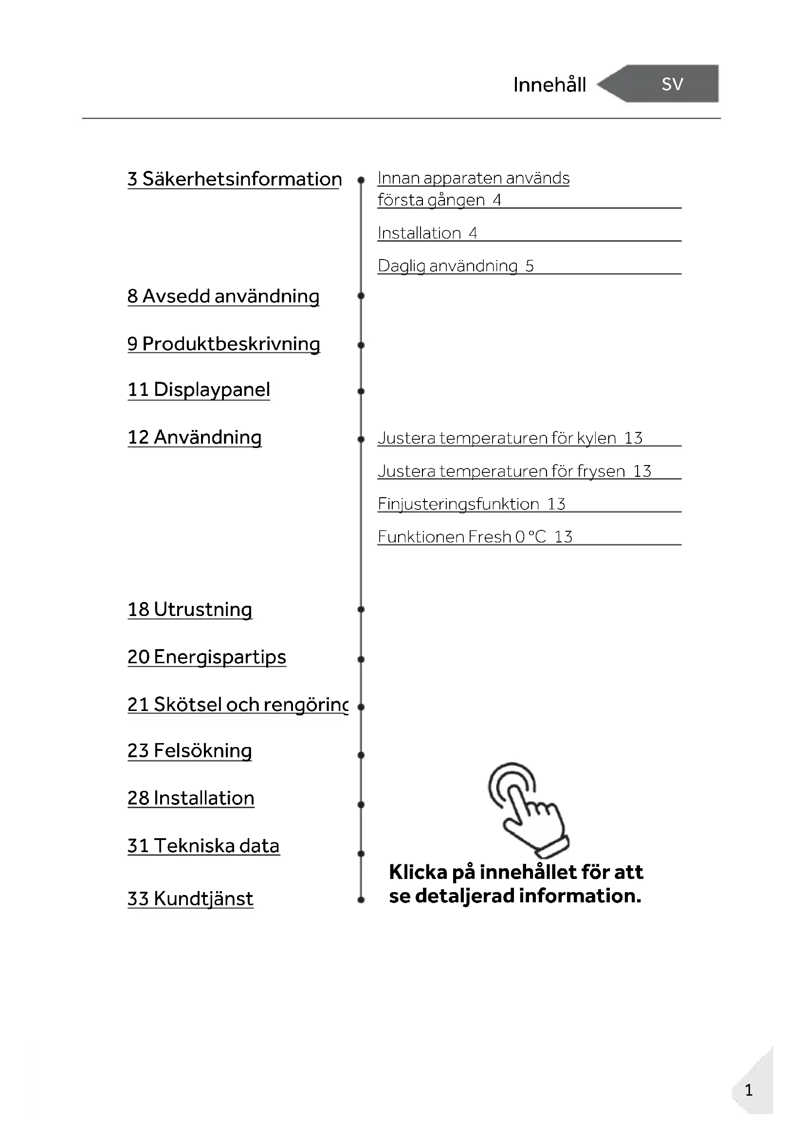 Innan apparaten används första gången 4 Installation 4 Daglig användning 5 Justera temperaturen för kylen 13 Justera temperaturen för frysen 13 Finjusteringsfunktion 13 Funktionen Fresh 0 °C 13 Klicka på innehållet för att se detaljerad information. 18 Utrustning 20 Energispartips 21 Skötsel och rengöring 23 Felsökning 28 Installation 31 Tekniska data 33 KundtjänstTack!