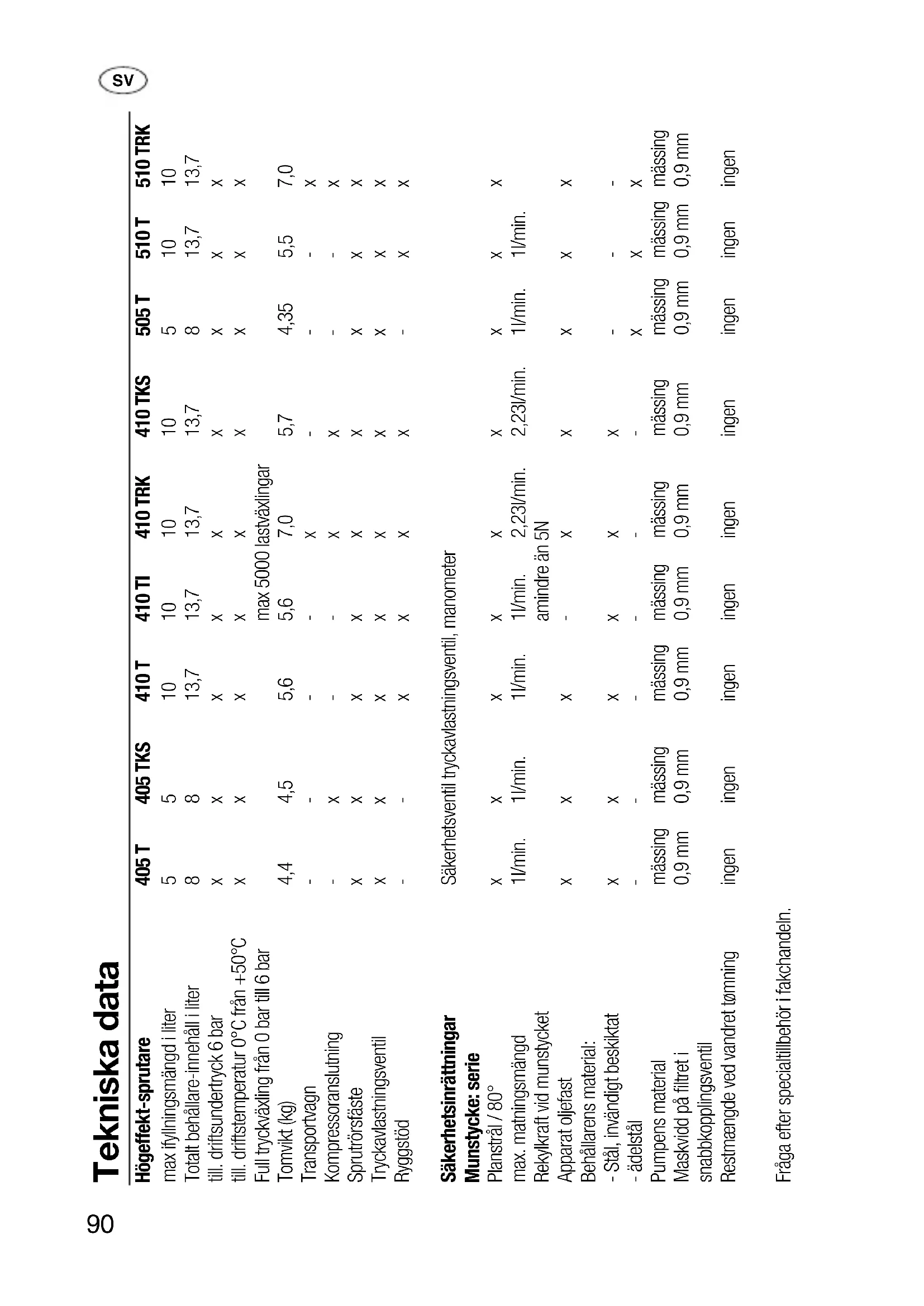 - Tekniska data Högeffekt-sprutare 405 T 405 TKS 410 T 410 TI 410 TRK 410 TKS 505 T 510 T 510 TRK max ifyllningsmängd i liter 5 5 10 10 10 10 5 10 10 Totalt behållare-innehåll i liter 8 8 13,7 13,7 13,7 13,7 8 13,7 13,7 till. driftsundertryck 6 bar x x x x x x x x x till. driftstemperatur 0°C från +50°C x x x x x x x x x Full tryckväxling från 0 bar till 6 bar max 5000 lastväxlingar Tomvikt (kg) 4,4 4,5 5,6 5,6 7,0 5,7 4,35 5,5 7,0 Transportvagn - - - - x - - - x Kompressoranslutning - x - - x x - - x Sprutrörsfäste x x x x x x x x x Tryckavlastningsventil x x x x x x x x x Ryggstöd - - x x x x - x x Säkerhetsinrättningar Säkerhetsventil tryckavlastningsventil, manometer Munstycke: serie Planstrål / 80° x x x x x x x x x max. matningsmängd 1l/min. 1l/min. 1l/min. 1l/min. 2,23l/min. 2,23l/min. 1l/min. 1l/min. Rekylkraft vid munstycket amindre än 5N Apparat oljefast x x x - x x x x x Behållarens material: - Stål, invändigt beskiktat x x x x x x - - - - ädelstål - - - - - - x x x Pumpens material mässing mässing mässing mässing mässing mässing mässing mässing mässing Maskvidd på filtret i 0,9 mm 0,9 mm 0,9 mm 0,9 mm 0,9 mm 0,9 mm 0,9 mm 0,9 mm 0,9 mm snabbkopplingsventil Restmængde ved vandret tømning ingen ingen ingen ingen ingen ingen ingen ingen ingen Fråga efter specialtillbehör i fakchandeln.91 Innehållsförteckning Tekniska data p. 90