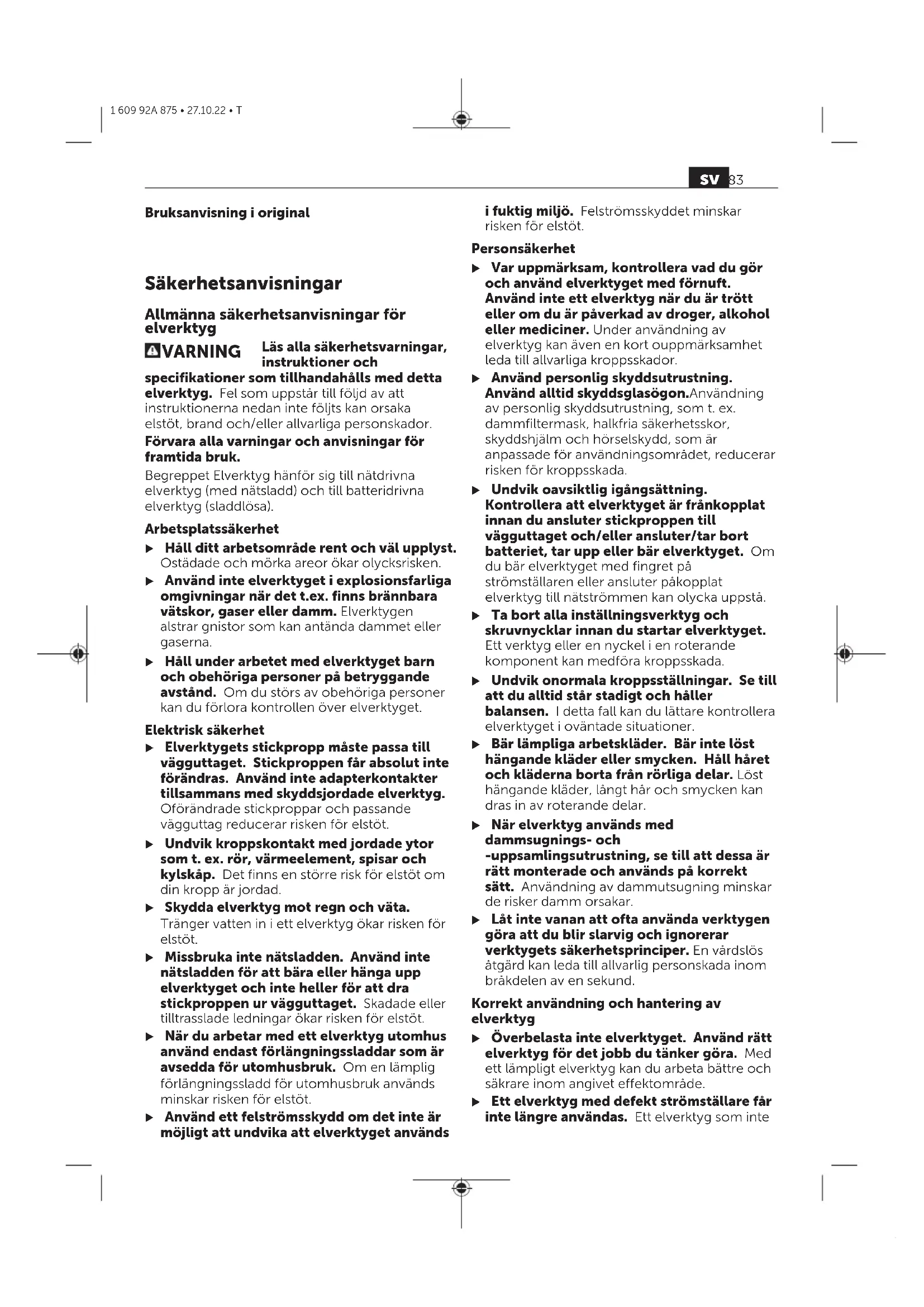 (Angitte verdier for saging av sponplater gjelder for en emnetykkelse på 20mm.) Vibrasjonsnivået og støyemisjonen som er angitt i disse anvisningene er målt i samsvar med en standardisert målemetode og kan brukes til sammenligning av elektroverktøy. Verdiene egner seg også til en foreløpig estimering av vibrasjonsnivået og støyutslippet. Angitt vibrasjonsnivå og støyutslipp representerer de hovedsakelige bruksområdene til elektroverktøyet. Men hvis elektroverktøyet brukes til andre formål, med andre innsatsverktøy eller utilstrekkelig vedlikehold, kan vibrasjonsnivået og støyutslippet avvike fra det som er angitt. Dette kan føre til en betydelig økning av vibrasjonsnivået og støyutslippet for hele arbeidstidsrommet. For en nøyaktig vurdering av vibrasjonsnivået og støyutslippet skal det også tas hensyn til de tidene verktøyet er slått av, eller går, men ikke faktisk er i bruk. Dette kan redusere vibrasjonsnivået og støyutslippet for hele arbeidstidsrommet betraktelig. Bestem ekstra sikkerhetstiltak til beskyttelse av brukeren mot vibrasjonenes virkning, som for eksempel: Vedlikehold av elektroverktøy og innsatsverktøy, holde hendene varme, organisere arbeidsforløpene. BatteriNorsk Lade batterietNorsk u Bruk bare laderne som er oppført i de tekniske spesifikasjonene. Kun disse laderne er tilpasset til Li-ion-batteriet som er brukt i elektroverktøyet. Merknad: I samsvar med internasjonale transportforskrifter blir litium-ion-batterier levert delvis ladet. For å sikre full effekt fra batteriet må du lade det helt opp før første gangs bruk. Sette inn batterietNorsk Skyv det oppladede batteriet inn i batteriholderen til det låses ordentlig. Ta ut batterietNorsk For å ta ut batteriet trykker du på utløserknappen og trekker batteriet ut. Ikke bruk makt. Batteriethar tolåsetrinn som skal hindre at batteriet faller ut hvis batteriutløserknappentrykkes inn utilsiktet. Så lenge batteriet er satt inn i elektroverktøyet, holdes det i posisjon av en fjær. Indikator for batteriladenivåNorsk De grønne lysdiodene i batteriets ladenivåindikator viser batteriets ladenivå. Av sikkerhetsgrunner er det bare mulig å få vist ladenivået når elektroverktøyet er stoppet. Trykk på knappen for indikatoren for batteriets ladenivå eller for å se ladenivået. Dette er mulig også når batteriet er tatt ut. Hvis ingen lysdiode lyser etter at knappen for indikatoren for batteriets ladenivå er trykt inn, er batteriet defekt og må skiftes ut. Batteritype GBA 18V...Norsk Lysdiode Kapasitet Lyser kontinuerlig 3 × grønt 60–100% Lyser kontinuerlig 2 × grønt 30–60% Lyser kontinuerlig 1 × grønt 5–30% Blinker 1 × grønt 0–5% no 79 1 609 92A 875 • 27.10.22 • TBatteritype ProCORE18V...Norsk Lysdiode Kapasitet Lyser kontinuerlig 5 × grønt 80–100% Lyser kontinuerlig 4 × grønt 60–80% Lyser kontinuerlig 3 × grønt 40–60% Lyser kontinuerlig 2 × grønt 20–40% Lyser kontinuerlig 1 × grønt 5–20% Blinker 1 × grønt 0–5% Regler for optimal bruk av oppladbare batterierNorsk Beskytt batteriet mot fuktighet og vann. Batteriet må oppbevares ved temperatur fra −20°C til 50°C. Du må for eksempel ikke la det ligge i bilen om sommeren. Rengjør ventilasjonsslissene på batteriet regelmessig med en myk, ren og tørr pensel. En vesentlig kortere driftstid etter oppladingen er et tegn på at batteriet er oppbrukt og må skiftes ut. Følg anvisningene om kassering. MonteringNorsk u Ta alltid batteriet ut av elektroverktøyet før arbeider på elektroverktøyet utføres (f.eks. vedlikehold, verktøyskifte osv.) og før transport og oppbevaring. Det er fare for skader hvis du trykker på av/på-bryteren ved en feiltagelse. Sette inn/bytte sagbladNorsk u Bruk vernehansker ved montering eller bytte av innsatsverktøy. Innsatsverktøyene er skarpe og kan bli varme ved langvarig bruk. u Ved bytte av sagblad må sagbladfestet være rengjort for meterialrester, for eksempel tre- eller metallspon. Velge sagbladNorsk Bruk bare sagblad med 1/2"-universalskaft. Sagbladet skal ikke være lengre enn nødvendig for dette snittet. Sette inn sagblad (se bilde A)Norsk Drei låsehylsen(3) ca. 90° i pilretningen, og hold den fast. Trykk sagbladet(1) inn i sagbladfestet(10). Slipp låsehylsen igjen. u Kontroller at sagbladet sitter fast ved å trekke i det. Et løst sagblad kan falle ut og skade deg. For bestemte arbeider kan sagbladet(1) også snus 180° (tennene vender opp) og settes inn igjen. Ta ut sagbladet (se bilde B)Norsk u La sagbladet avkjøles før det tas ut. Berøring av et varmt sagblad medfører fare for skader. Drei låsehylsen (3) ca. 90° i pilretningen, og hold den fast. Ta ut sagbladet(1). Støv-/sponavsugingNorsk Støv fra materialer som blyholdig maling, noen tresorter, mineraler og metall kan være helsefarlige. Berøring eller innånding av støv kan utløse allergiske reaksjoner og/eller åndedrettssykdommer hos brukeren eller personer som befinner seg i nærheten. Visse typer støv som eik- eller bøkstøv gjelder som kreftfremkallende, spesielt i kombinasjon med tilsetningsstoffer til trebearbeidelse (kromat, trebeskyttelsesmidler). Asbestholdig materiale må kun bearbeides av fagfolk. – Sørg for god ventilasjon av arbeidsplassen. – Det anbefales å bruke en støvmaske med filterklasse P2. Følg ditt lands gyldige forskrifter for de materialene som skal bearbeides. u Unngå støv på arbeidsplassen. Støv kan lett antennes. BrukNorsk IgangsettingNorsk Slå på/av (se bildeC)Norsk For å slå på elektroverktøyet trykker du først innkoblingssperren(5) mot venstre. Deretter trykker du på av/på-bryteren (6) og holder den inne. Arbeidslyset lyser når av/på-bryteren (6) trykkes helt eller delvis inn, og gir mulighet til belysning av arbeidsplassen ved ugunstige lysforhold. For å slå av elektroverktøyet slipper du av/på- bryteren (6). Trykk deretter innkoblingssperren(5) mot høyre igjen. Styre slagtalletNorsk Du kan justere slag