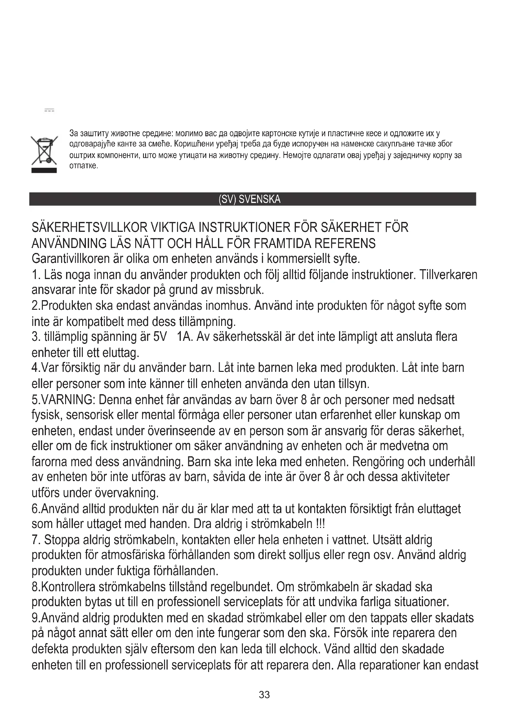 enheter till ett eluttag. 4.Var försiktig när du använder barn. Låt inte barnen leka med produkten. Låt inte barn eller personer som inte känner till enheten använda den utan tillsyn. 5.VARNING: Denna enhet får användas av barn över 8 år och personer med nedsatt fysisk, sensorisk eller mental förmåga eller personer utan erfarenhet eller kunskap om enheten, endast under överinseende av en person som är ansvarig för deras säkerhet, eller om de fick instruktioner om säker användning av enheten och är medvetna om farorna med dess användning. Barn ska inte leka med enheten. Rengöring och underhåll av enheten bör inte utföras av barn, såvida de inte är över 8 år och dessa aktiviteter utförs under övervakning. 6.Använd alltid produkten när du är klar med att ta ut kontakten försiktigt från eluttaget som håller uttaget med handen. Dra aldrig i strömkabeln !!!
