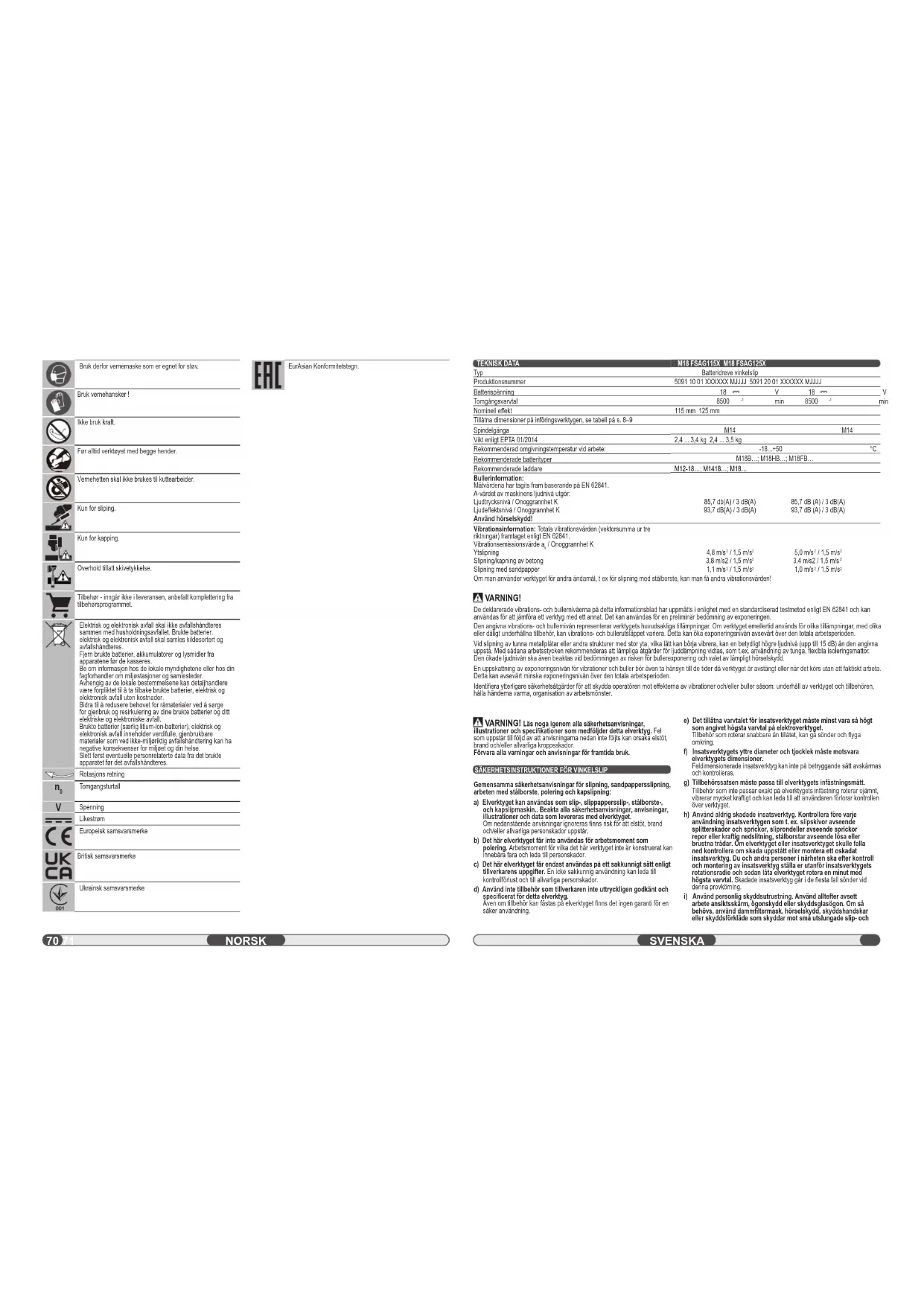 arbete ansiktsskärm, ögonskydd eller skyddsglasögon. Om så behövs, använd dammfi ltermask, hörselskydd, skyddshandskar eller skyddsförkläde som skyddar mot små utslungade slip- och Om man använder verktyget för andra ändamål, t ex för slipning med stålborste, kan man få andra vibrationsvärden! VARNING! De deklarerade vibrations- och bullernivåerna på detta informationsblad har uppmätts i enlighet med en standardiserad testmetod enligt EN 62841 och kan användas för att jämföra ett verktyg med ett annat. Det kan användas för en preliminär bedömning av exponeringen. Den angivna vibrations- och bullernivån representerar verktygets huvudsakliga tillämpningar. Om verktyget emellertid används för olika tillämpningar, med olika eller dåligt underhållna tillbehör, kan vibrations- och bullerutsläppet variera. Detta kan öka exponeringsnivån avsevärt över den totala arbetsperioden. Vid slipning av tunna metallplåtar eller andra strukturer med stor yta, vilka lätt kan börja vibrera, kan en betydligt högre ljudnivå (upp till 15 dB) än den angivna uppstå. Med sådana arbetsstycken rekommenderas att lämpliga åtgärder för ljuddämpning vidtas, som t.ex. användning av tunga, fl exibla isoleringsmattor. Den ökade ljudnivån ska även beaktas vid bedömningen av risken för bullerexponering och valet av lämpligt hörselskydd. En uppskattning av exponeringsnivån för vibrationer och buller bör även ta hänsyn till de tider då verktyget är avstängt eller när det körs utan att faktiskt arbeta. Detta kan avsevärt minska exponeringsnivån över den totala arbetsperioden. Identifi era ytterligare säkerhetsåtgärder för att skydda operatören mot eff ekterna av vibrationer och/eller buller såsom: underhåll av verktyget och tillbehören, hålla händerna varma, organisation av arbetsmönster. Batteridreve vinkelslip SVENSKA Bruk derfor vernemaske som er egnet for støv. Bruk vernehansker ! Ikke bruk kraft. Før alltid verktøyet med begge hender. Vernehetten skal ikke brukes til kuttearbeider. Kun for sliping. Kun for kapping. Overhold tillatt skivetykkelse. Tilbehør - inngår ikke i leveransen, anbefalt komplettering fra tilbehørsprogrammet. Elektrisk og elektronisk avfall skal ikke avfallshåndteres sammen med husholdningsavfallet. Brukte batterier. elektrisk og elektronisk avfall skal samles kildesortert og avfallshåndteres. Fjern brukte batterier, akkumulatorer og lysmidler fra apparatene før de kasseres. Be om informasjon hos de lokale myndighetene eller hos din fagforhandler om miljøstasjoner og samlesteder. Avhengig av de lokale bestemmelsene kan detaljhandlere være forpliktet til å ta tilbake brukte batterier, elektrisk og elektronisk avfall uten kostnader. Bidra til å redusere behovet for råmaterialer ved å sørge for gjenbruk og resirkulering av dine brukte batterier og ditt elektriske og elektroniske avfall. Brukte batterier (særlig litium-ion-batterier), elektrisk og elektronisk avfall inneholder verdifulle, gjenbrukbare materialer som ved ikke-miljøriktig avfallshåndtering kan ha negative konsekvenser for miljøet og din helse. Slett først eventuelle personrelaterte data fra det brukte apparatet før det avfallshåndteres. Rotasjons retning