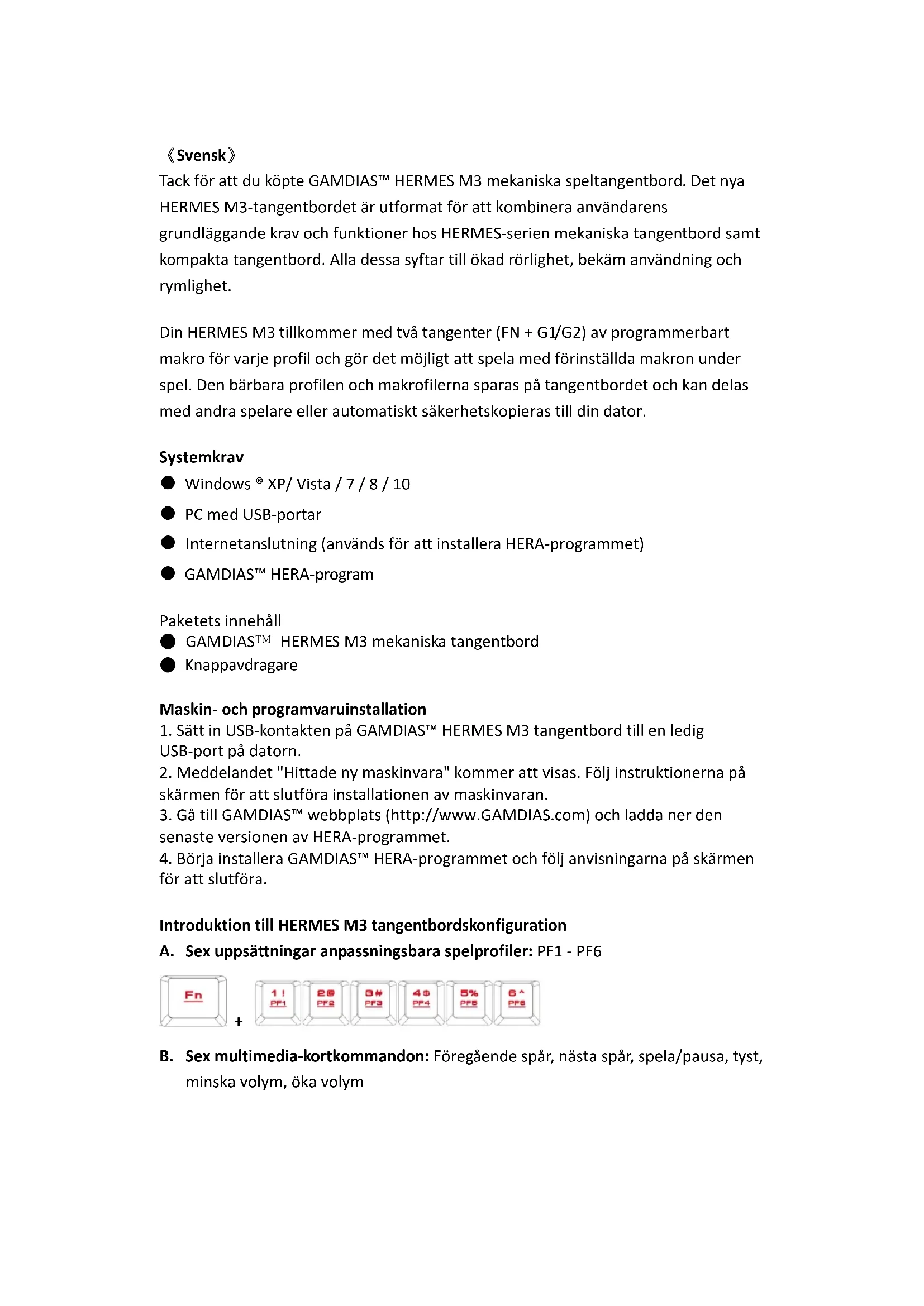 Tack för att du köpte GAMDIAS™ HERMES M3 mekaniska speltangentbord. Det nya HERMES M3-tangentbordet är utformat för att kombinera användarens grundläggande krav och funktioner hos HERMES-serien mekaniska tangentbord samt kompakta tangentbord. Alla dessa syftar till ökad rörlighet, bekäm användning och rymlighet. Din HERMES M3 tillkommer med två tangenter (FN + G1/G2) av programmerbart makro för varje profil och gör det möjligt att spela med förinställda makron under spel. Den bärbara profilen och makrofilerna sparas på tangentbordet och kan delas med andra spelare eller automatiskt säkerhetskopieras till din dator. Systemkrav ● Windows ® XP/ Vista / 7 / 8 / 10 ● PC med USB-portar ● Internetanslutning (används för att installera HERA-programmet) ● GAMDIAS™ HERA-program Paketets innehåll ● GAMDIAS™ HERMES M3 mekaniska tangentbord ● Knappavdragare Maskin- och programvaruinstallation